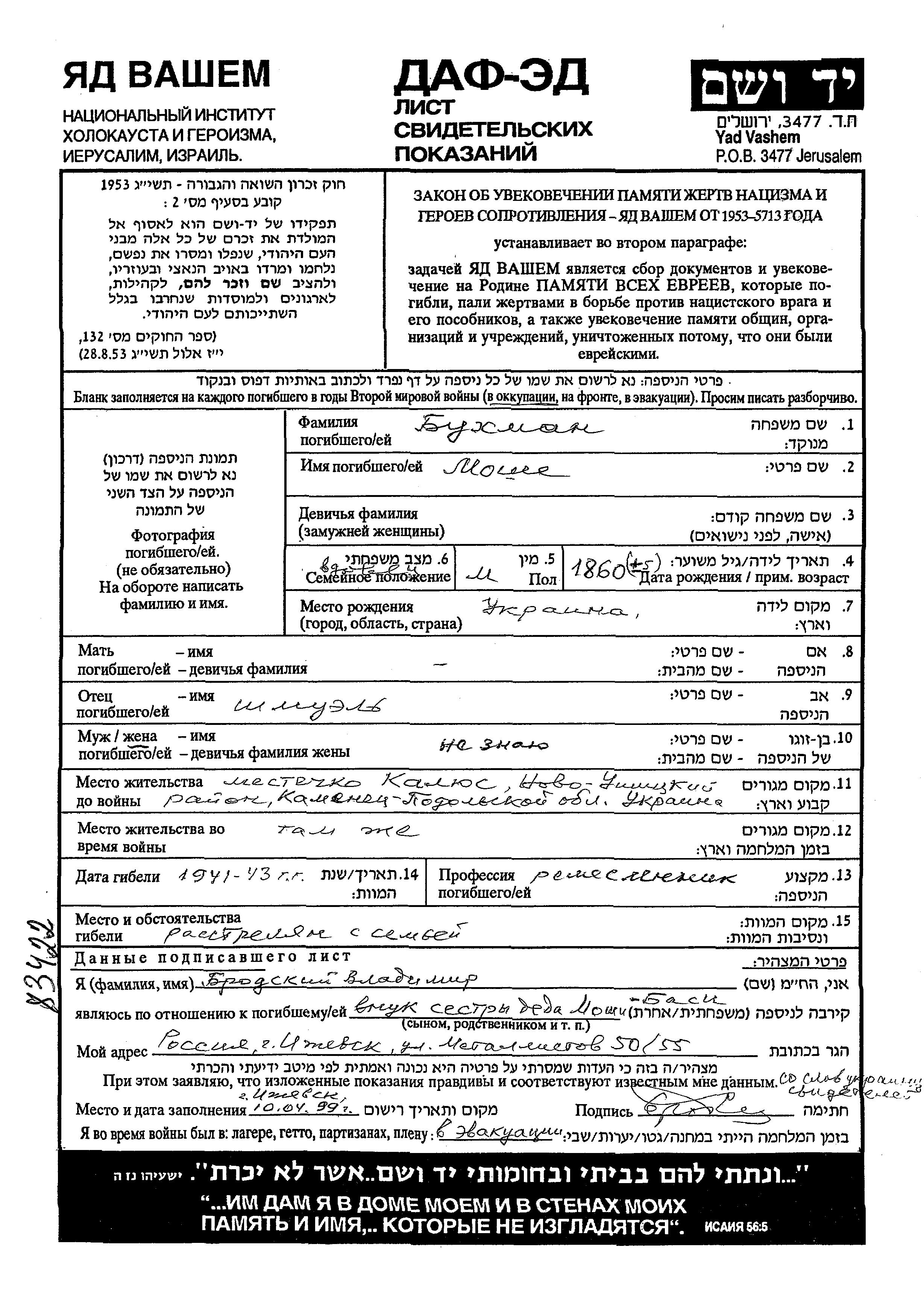 Moshe Bukhman was born in Ukraine (USSR), 1860 to Shmuel. He was a craftsman and a widower. Prior to WWII he lived in Kalyus, Ukraine (USSR). During the war he was in Kalyus, Ukraine (USSR). Moshe was murdered in the Shoah. Place of death: unknown, 1941.