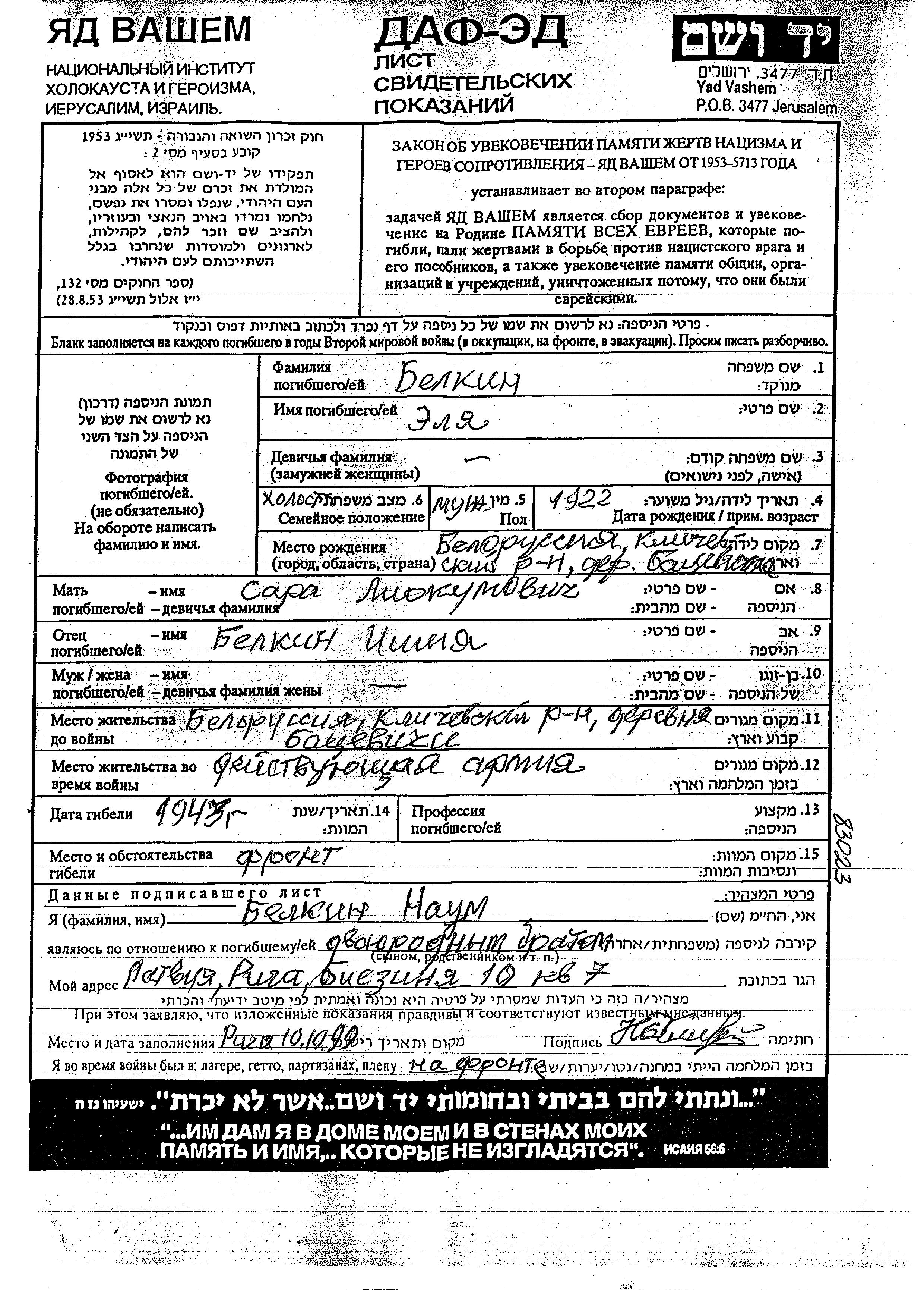 Elya Belkin was born in Batsevichi, Belorussia (USSR), 1922 to Ishiya and Sara. He was single. Prior to WWII he lived in Batsevichi, Belorussia (USSR). During the war he was in the Soviet armed forces. Elya was killed in military service in WWII. Place of death: unknown, 1943.