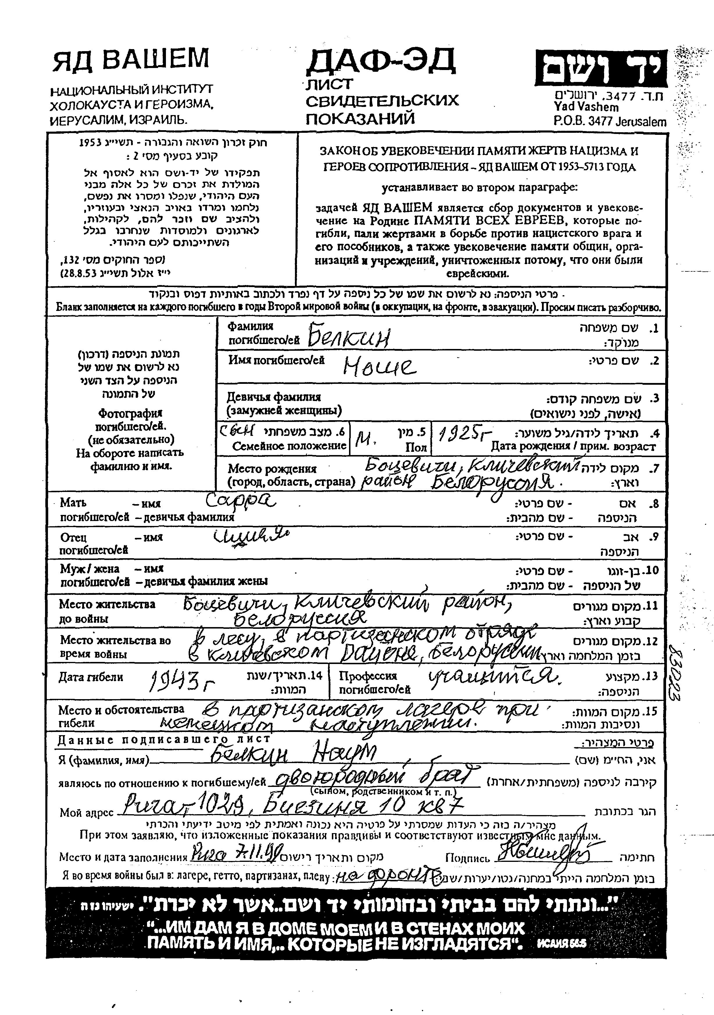 Moshe Belkin was born in Batsevichi, Belorussia (USSR), 1925 to Ishiya and Sara. He was a pupil. Prior to WWII he lived in Batsevichi, Belorussia (USSR). During the war he was in Belorussia (USSR). Moshe was murdered in the Shoah. Place of death: Belorussia (USSR), 1943.