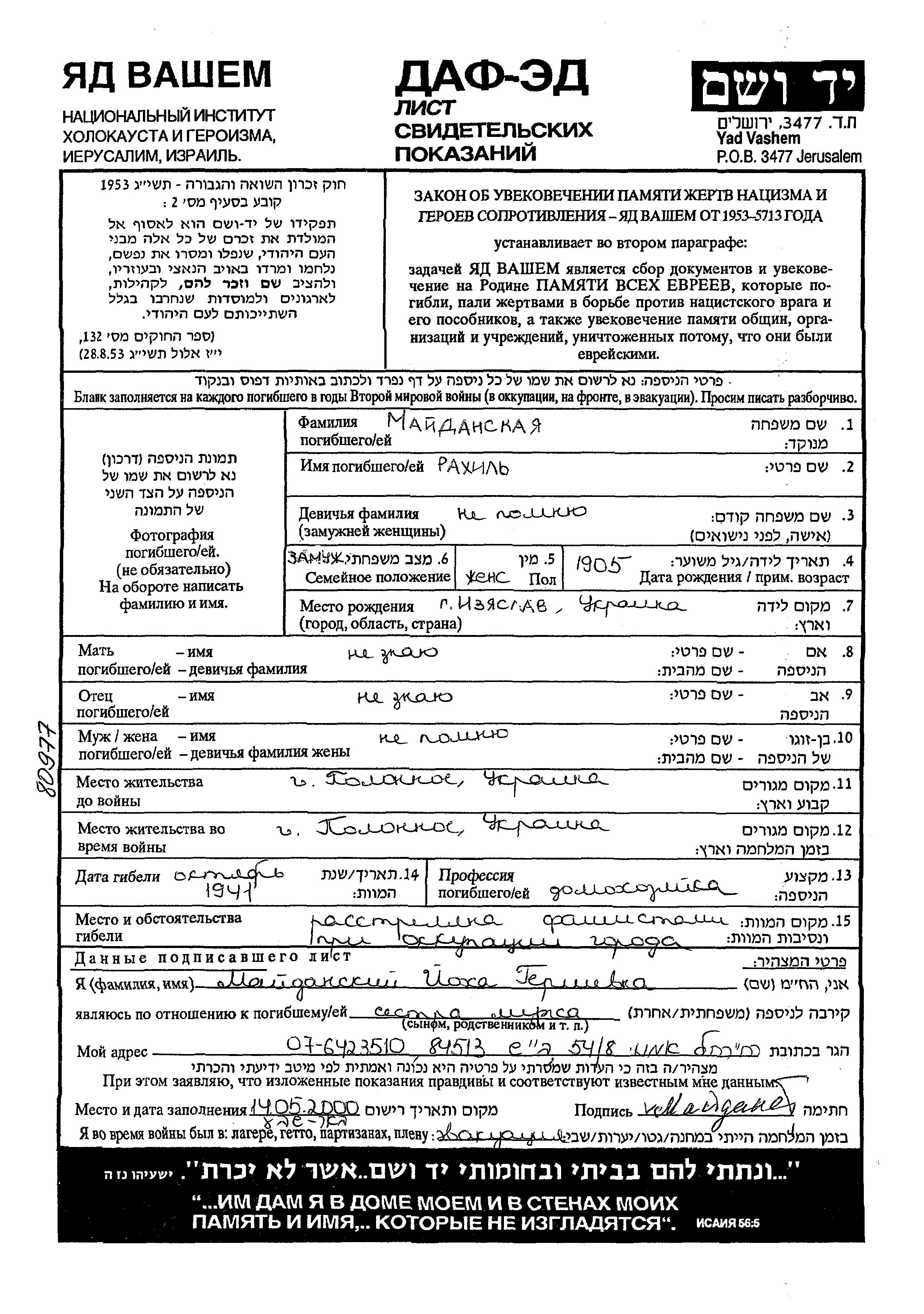 Rakhil Maidansky was born in Izyaslav, Ukraine (USSR), 1905. She was a housewife and married. Prior to WWII she lived in Polonnoye, Ukraine (USSR). During the war she was in Polonnoye, Ukraine (USSR). Rakhil was murdered in the Shoah. Place of death: Polonnoye, Ukraine (USSR), 1941.