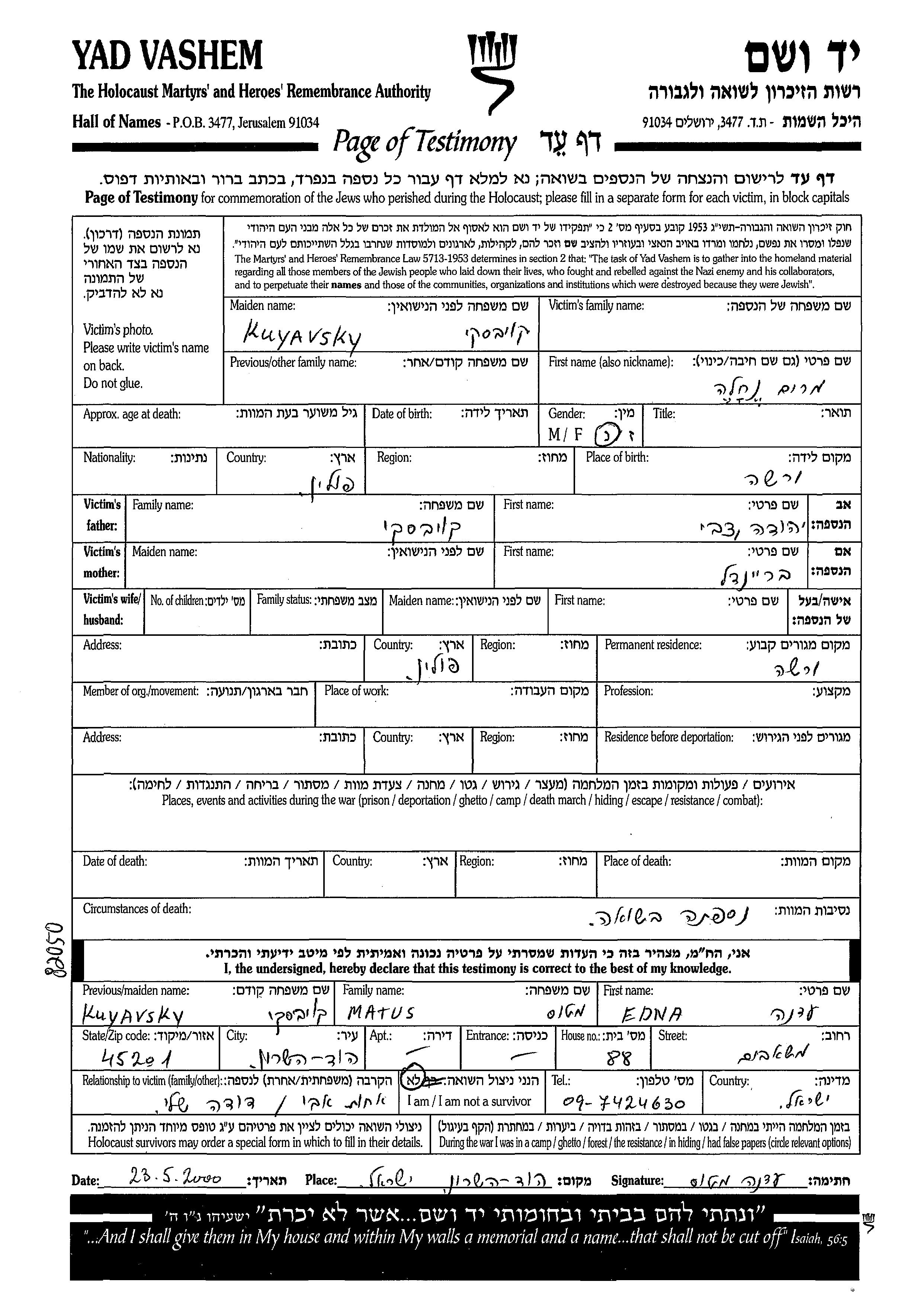 Yad Vashem - Pages of Testimony Names Memorial Collection
