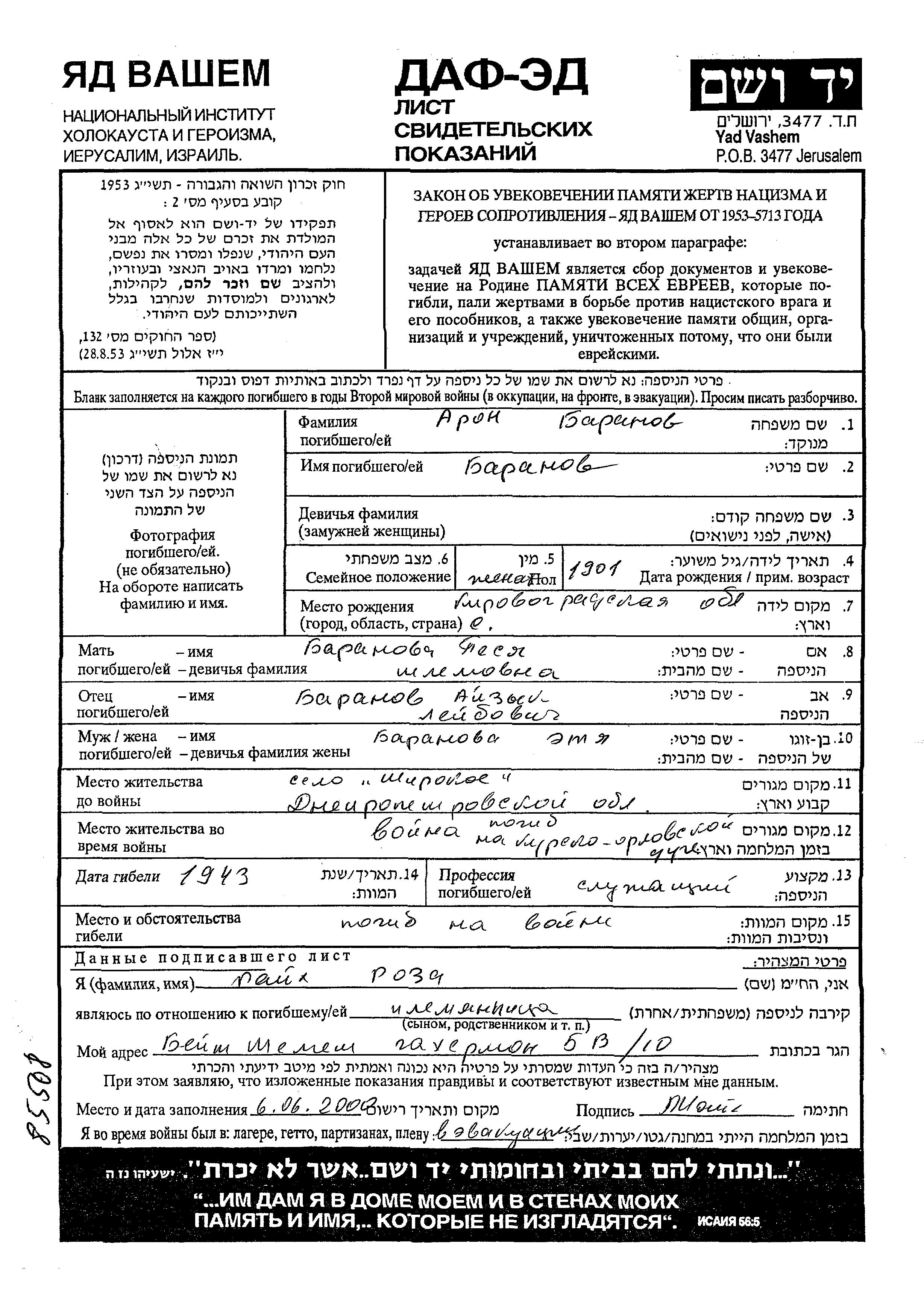 Aron Baranov was born in Kirovograd, Ukraine (USSR), 1901 to Aizyk and Pesya. He was an employee and married to Etya. Prior to WWII he lived in Shirokoye, Ukraine (USSR). Aron was killed in military service in WWII. Place of death: Kursk, Russia (USSR), 1943.