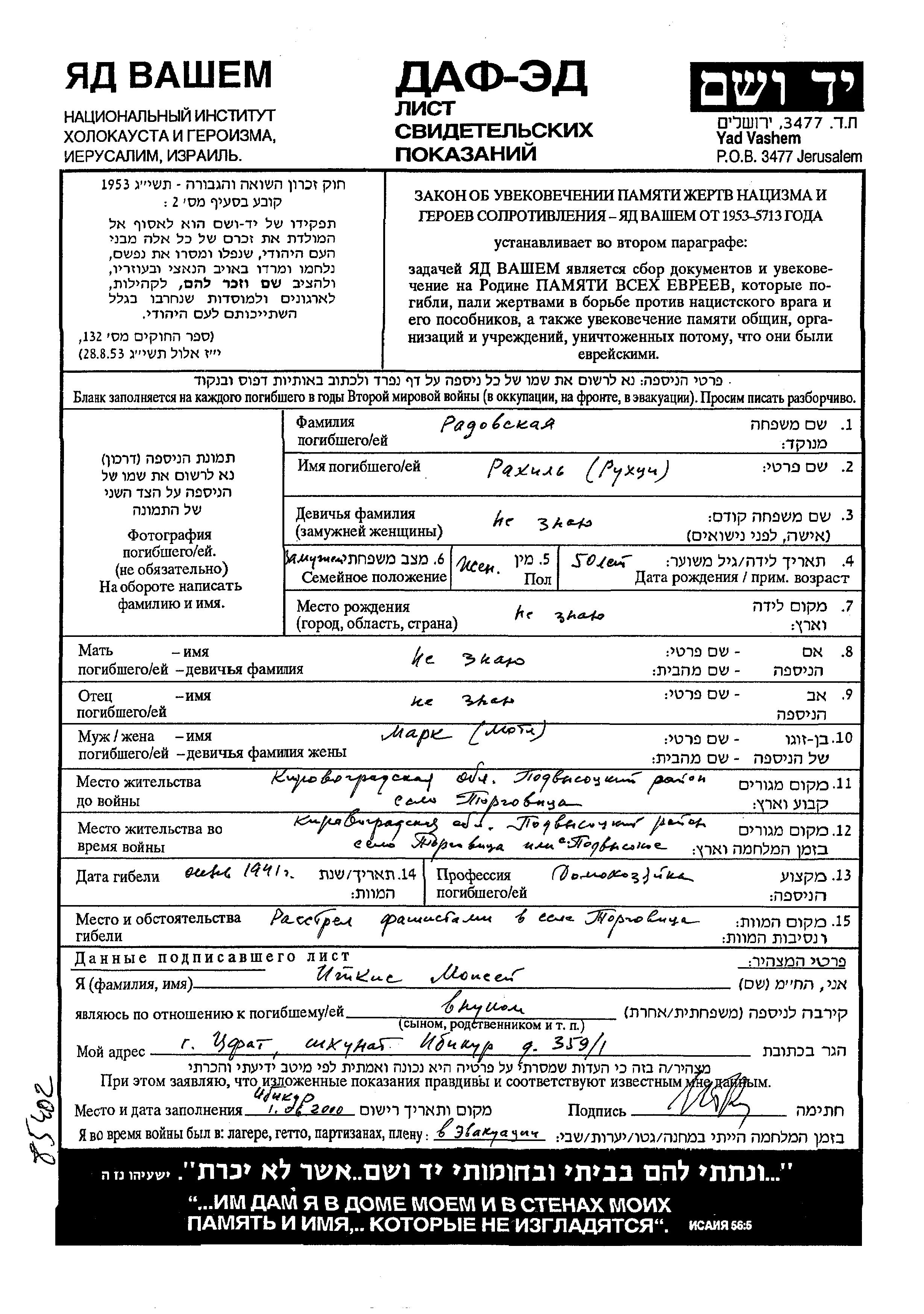 Rakhil Radovski. She was a housewife and married to Mark Motl. Prior to WWII she lived in Torgovitsa, Ukraine (USSR). During the war she was in Torgovitsa, Ukraine (USSR). Rakhil was murdered in the Shoah. Place of death: Torgovitsa, Ukraine (USSR), 1941.