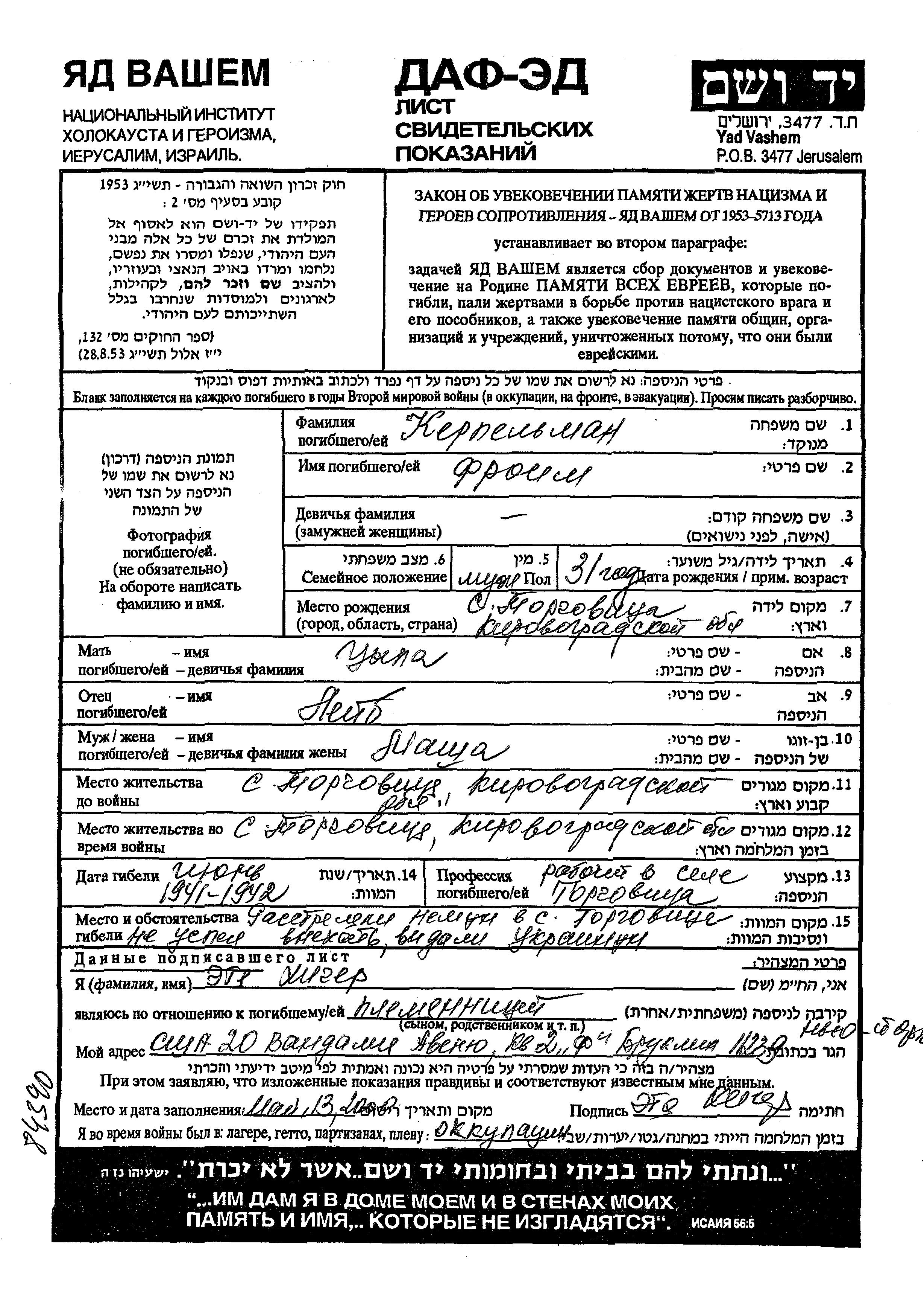 Froim Kerpelman was born in Torgovitsa, Ukraine (USSR) to Leib and Tzipa. He was a worker. Prior to WWII he lived in Torgovitsa, Ukraine (USSR). During the war he was in Torgovitsa, Ukraine (USSR). Froim was murdered in the Shoah. Place of death: Torgovitsa, Ukraine (USSR), 1941.
