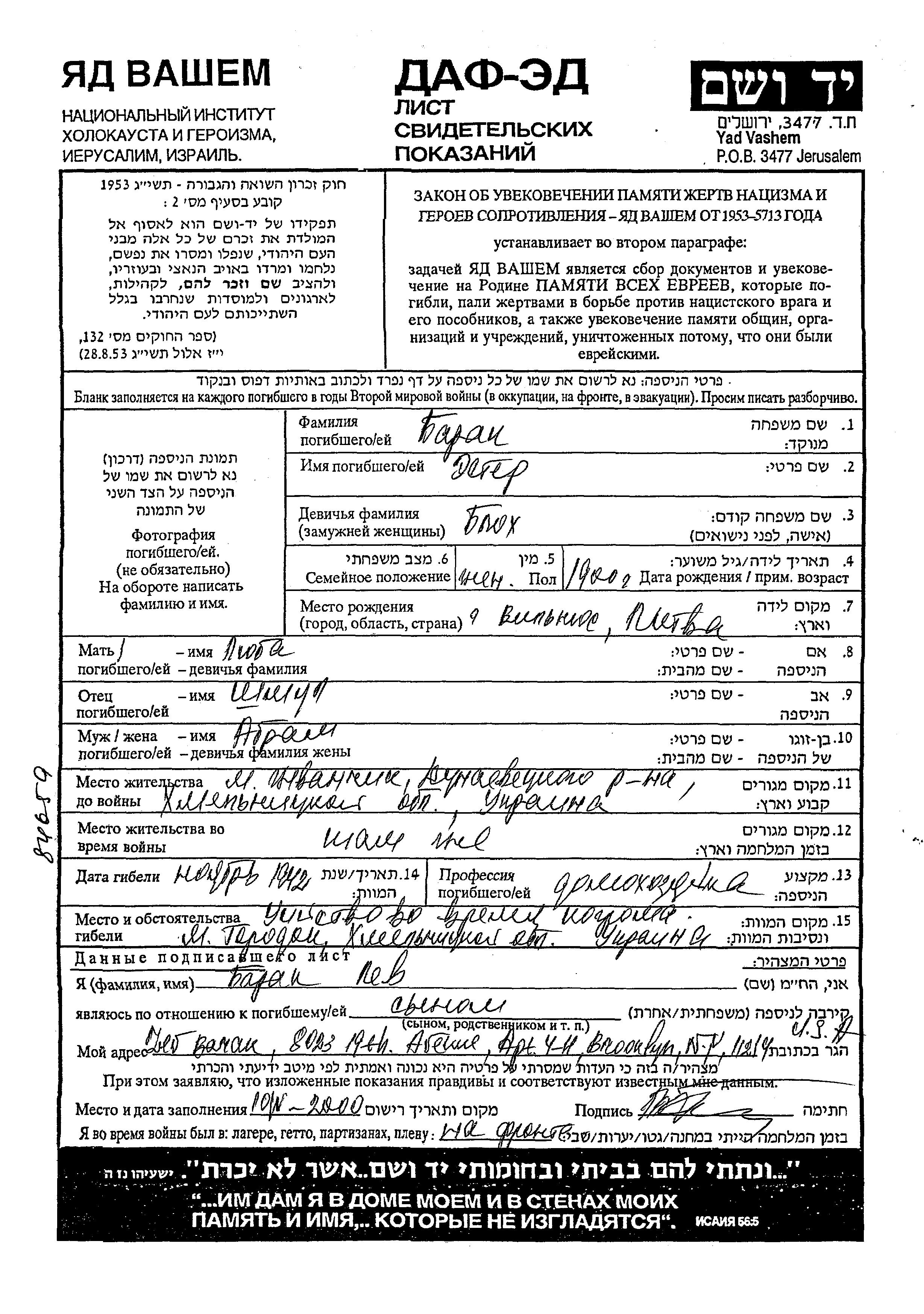 Ester Baran nee Blokh was born in Vilnius, Poland, 1900 to Shmul and Lyuba. She was a housewife. Prior to WWII she lived in Zhvanchik, Ukraine (USSR). During the war she was in Zhvanchik, Ukraine (USSR). Ester was murdered in the Shoah. Place of death: Gorodok, Ukraine (USSR), 1942.