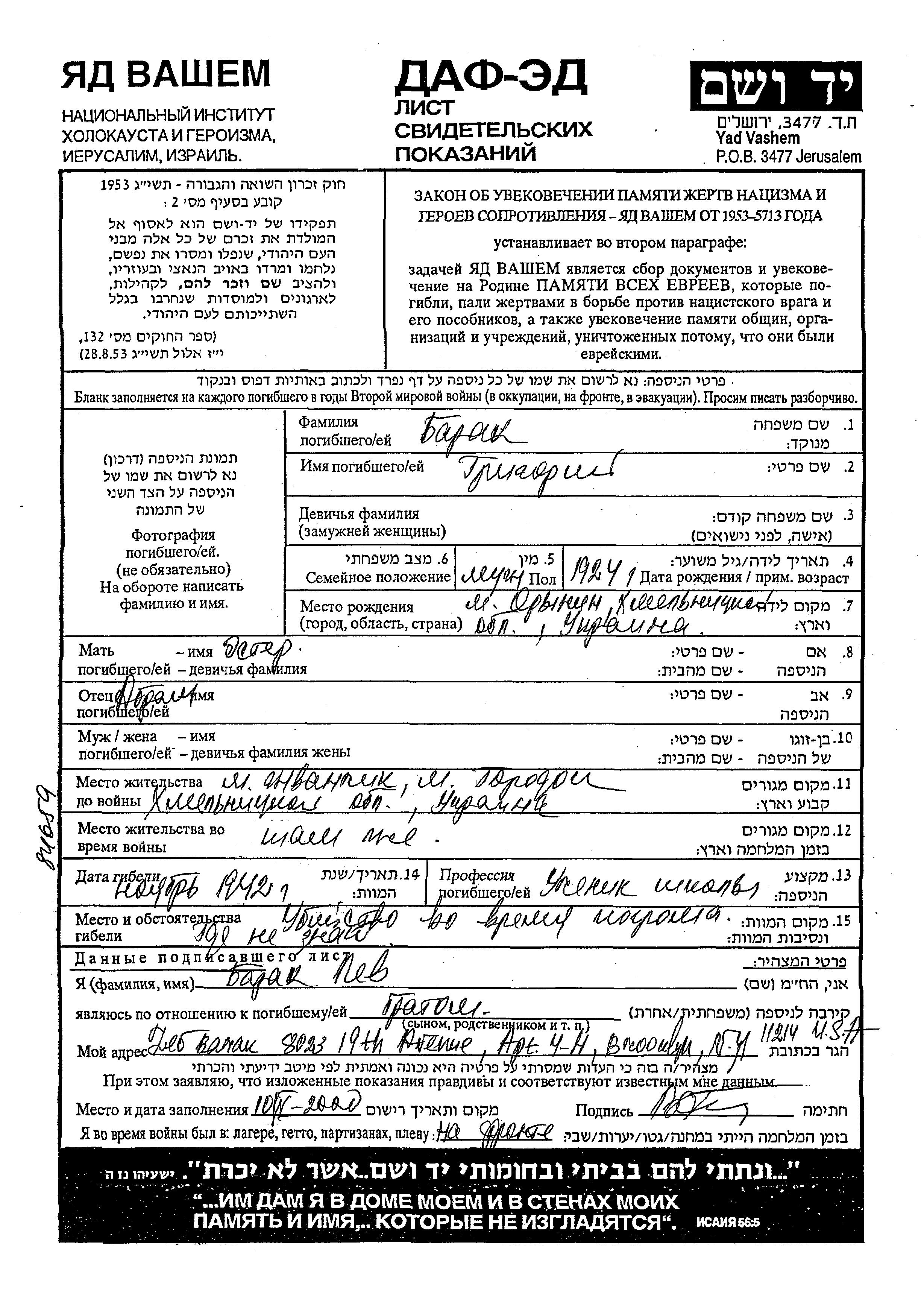 Grigori Barak was born in Orynin, Ukraine (USSR), 1924 to Abram and Ester. He was a pupil. Prior to WWII he lived in Zhvanchik, Ukraine (USSR). During the war he was in Gorodok, Ukraine (USSR). Grigori was murdered in the Shoah. Place of death: unknown, 1942.