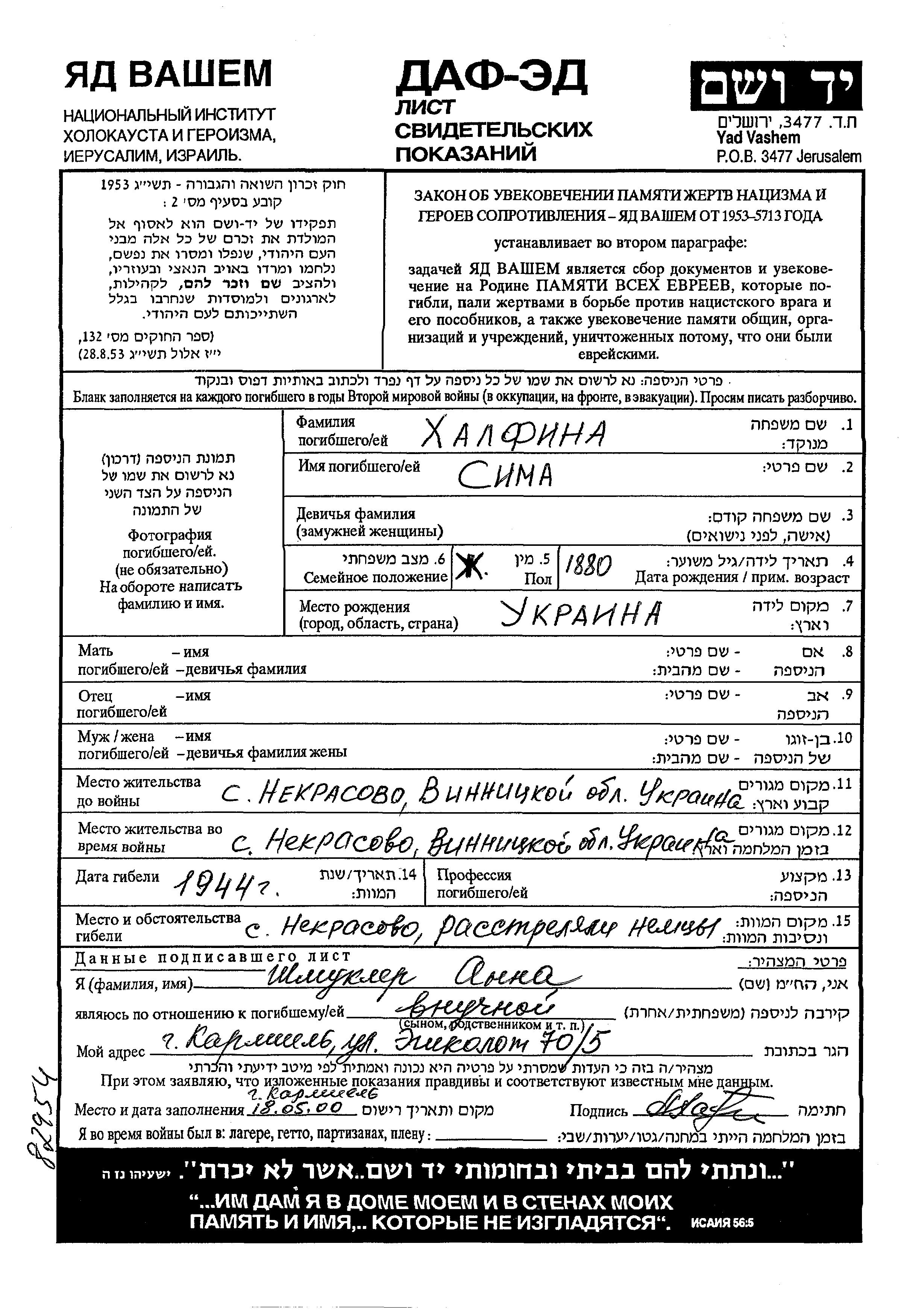 Sima Khalfin was born in Ukraine (USSR), 1880. Prior to WWII she lived in Nekrasovo, Ukraine (USSR). During the war she was in Nekrasovo, Ukraine (USSR). Sima was murdered in the Shoah. Place of death: Nekrasovo, Ukraine (USSR), 1944.