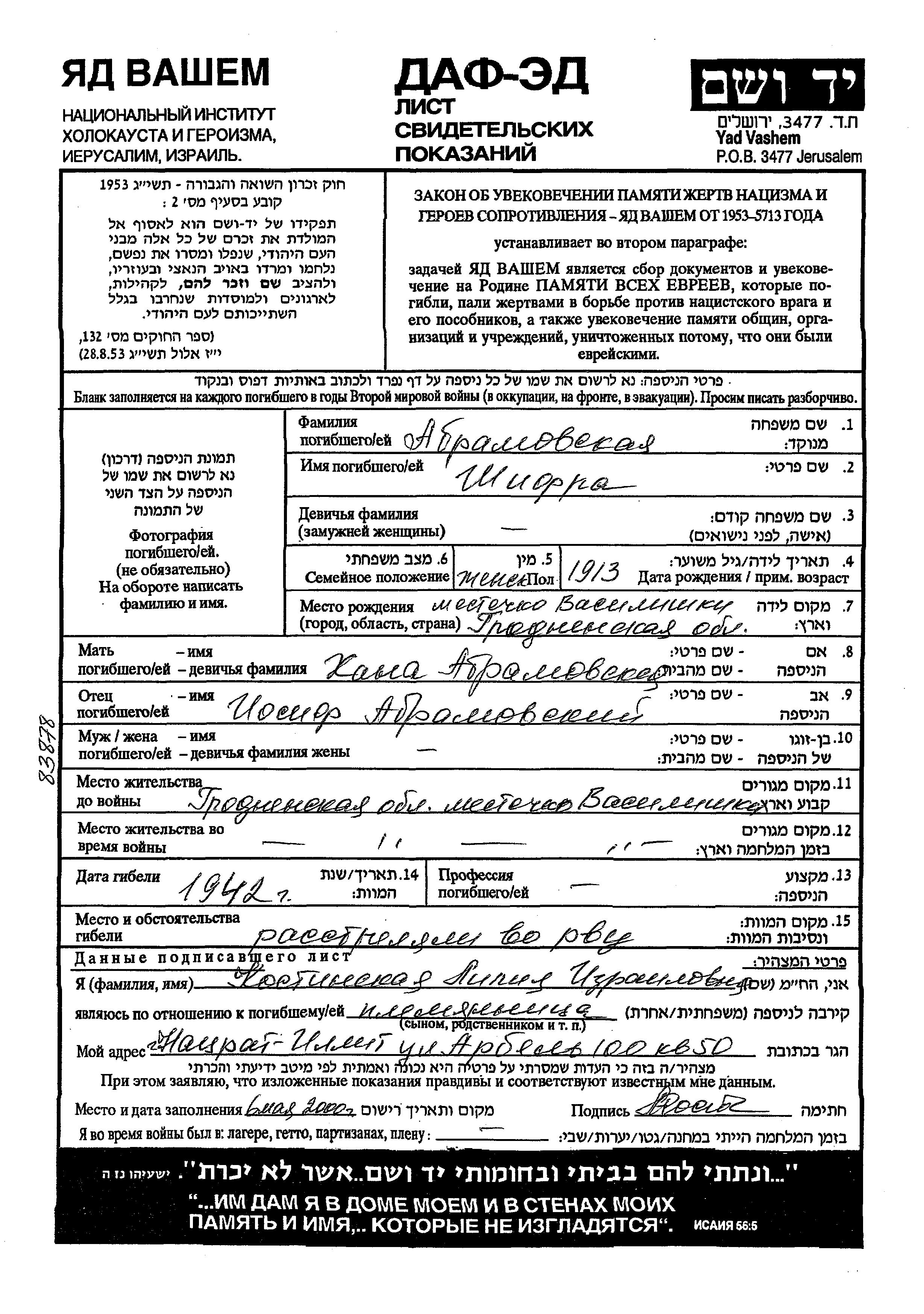 Yad Vashem - Pages of Testimony Names Memorial Collection