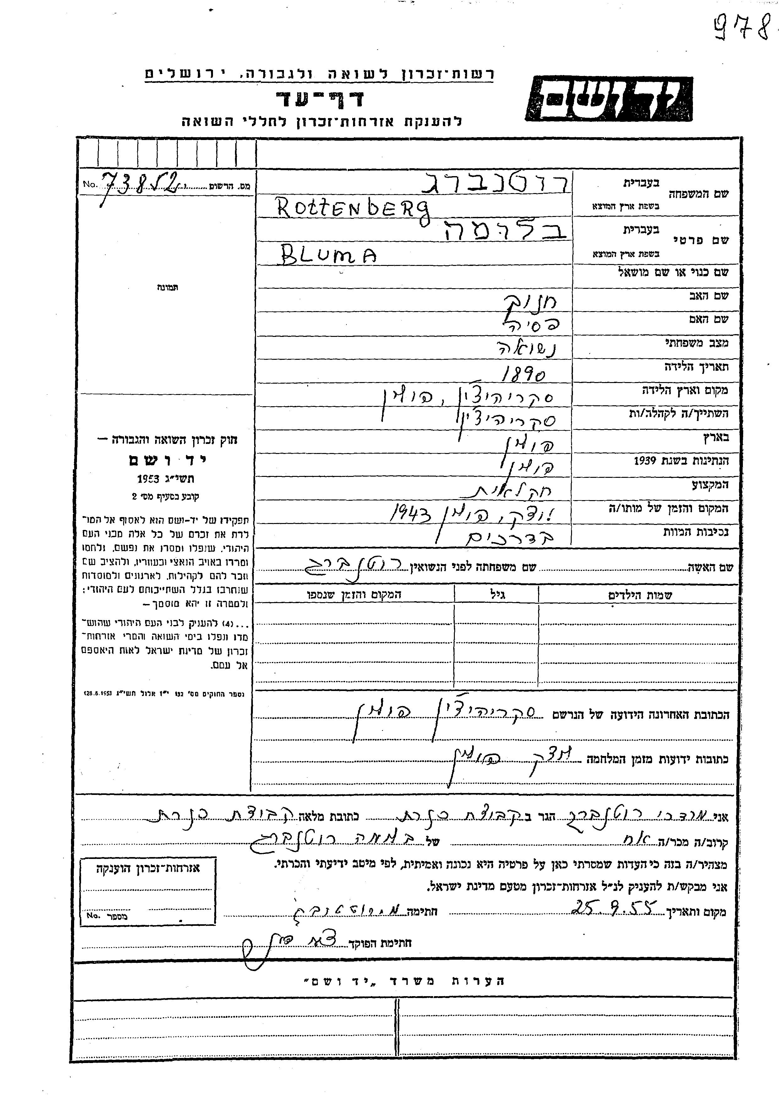 Bluma Rottenberg was born in Skryhiczyn, Poland, 1890 to Khanokh and Pesia. She was an agriculturist. Prior to WWII she lived in Skryhiczyn, Poland. During the war she was in Luck, Poland. Bluma was murdered in the Shoah. Place of death: Luck, Poland, 1943.