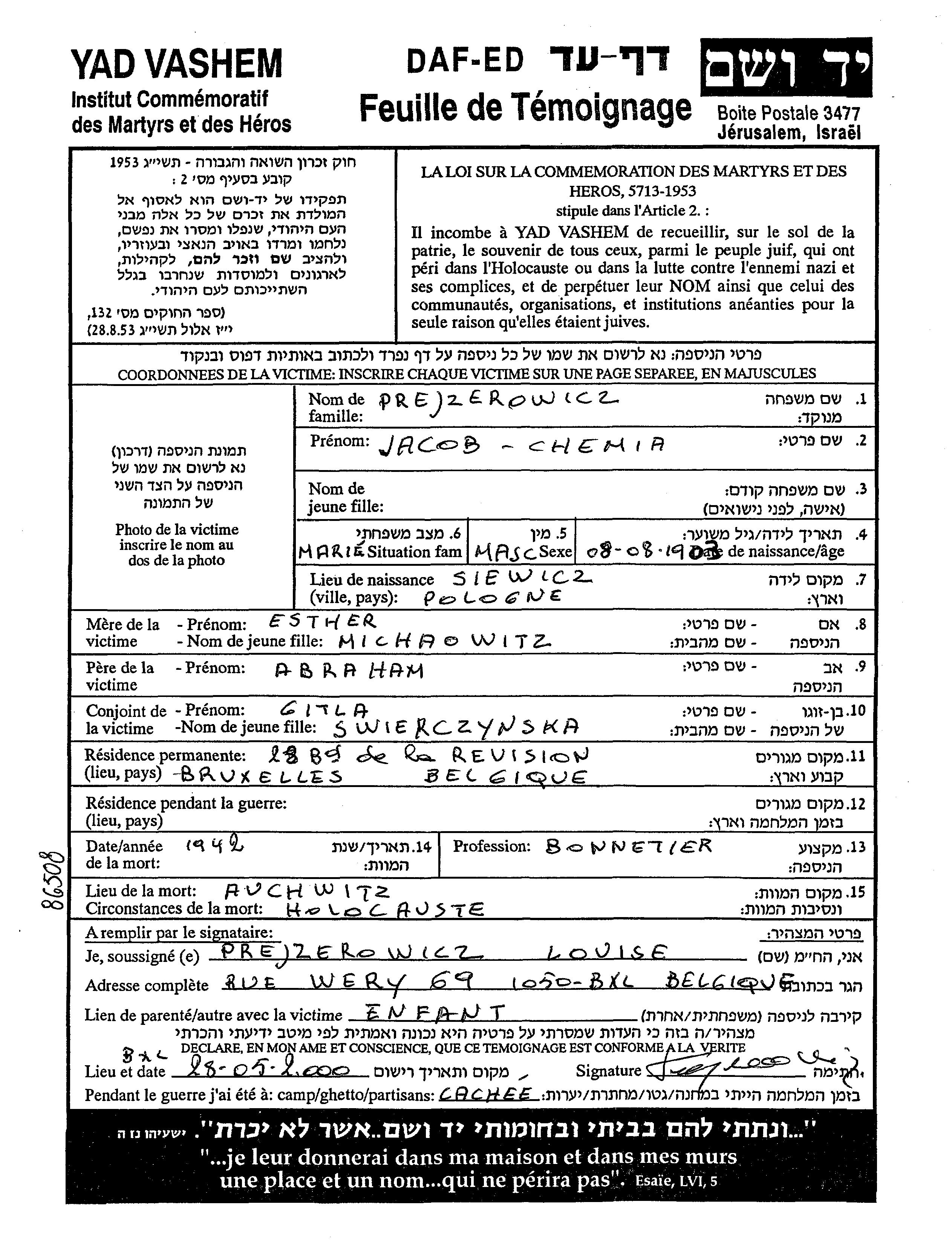 Jacob Chemia Prejzerowicz was born in Siewierz, Poland, 1903 to Abraham and Esther. He was a bonnetier and married to Gitla. Prior to WWII he lived in Bruxelles, Belgium. Jacob Chemia was murdered in the Shoah. Place of death: Auschwitz, Poland, 1942.
