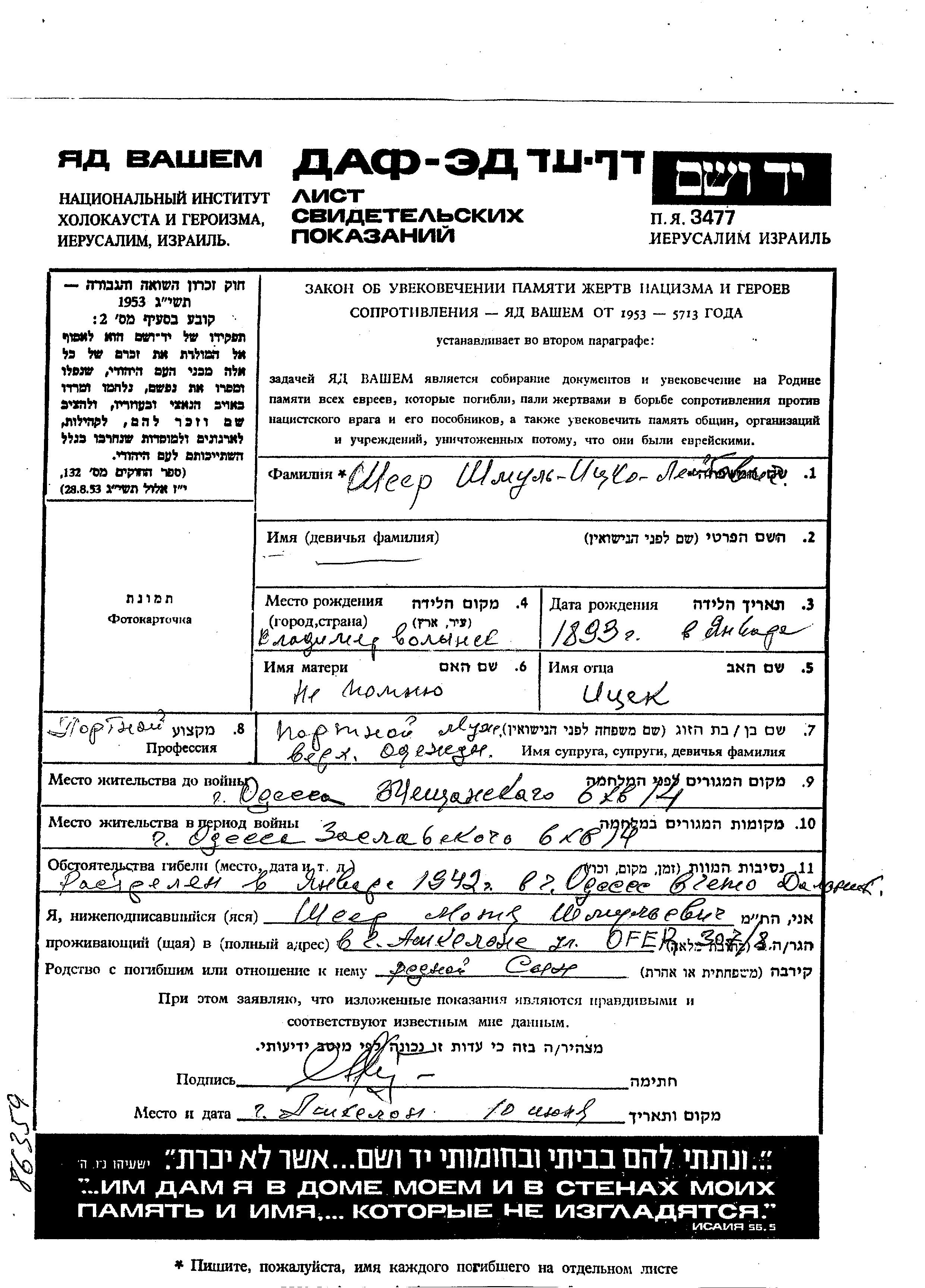 Sheer Shmul 1893 Odessa, Ukraine (USSR) Page of Testimony