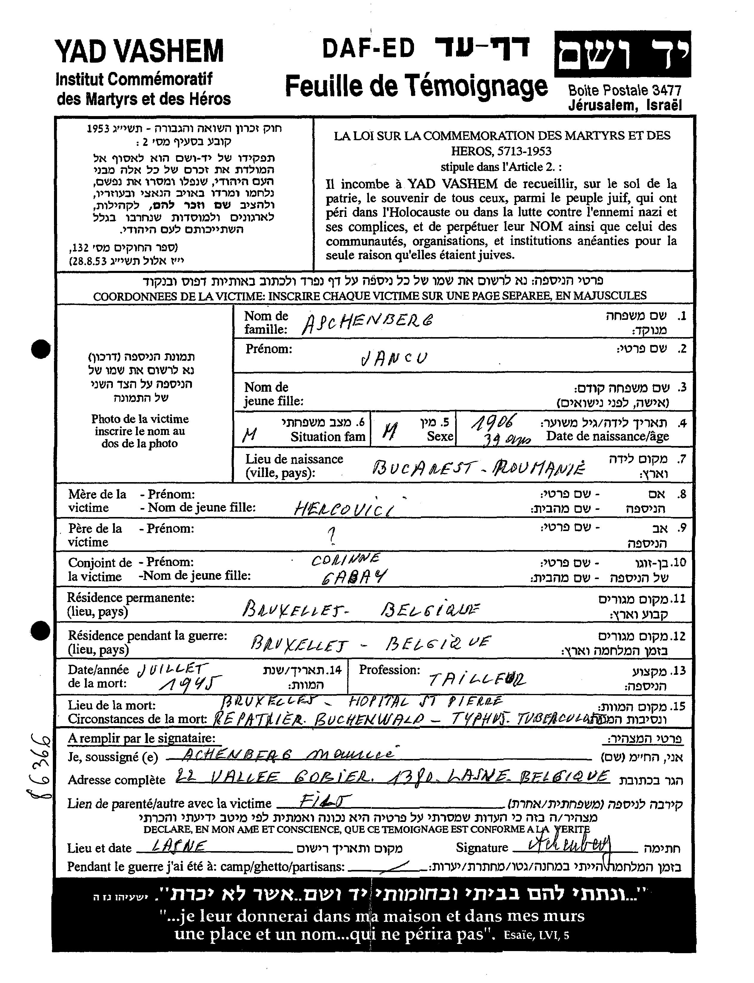 Jancu Aschenberg was born in Bucarest, Romania, 1906. He was a tailor and married to Corinne. Prior to WWII he lived in Bruxelles, Belgium. During the war he was in Bruxelles, Belgium. Jancu was murdered in the Shoah. Place of death: Bruxelles, Belgium, 1945.