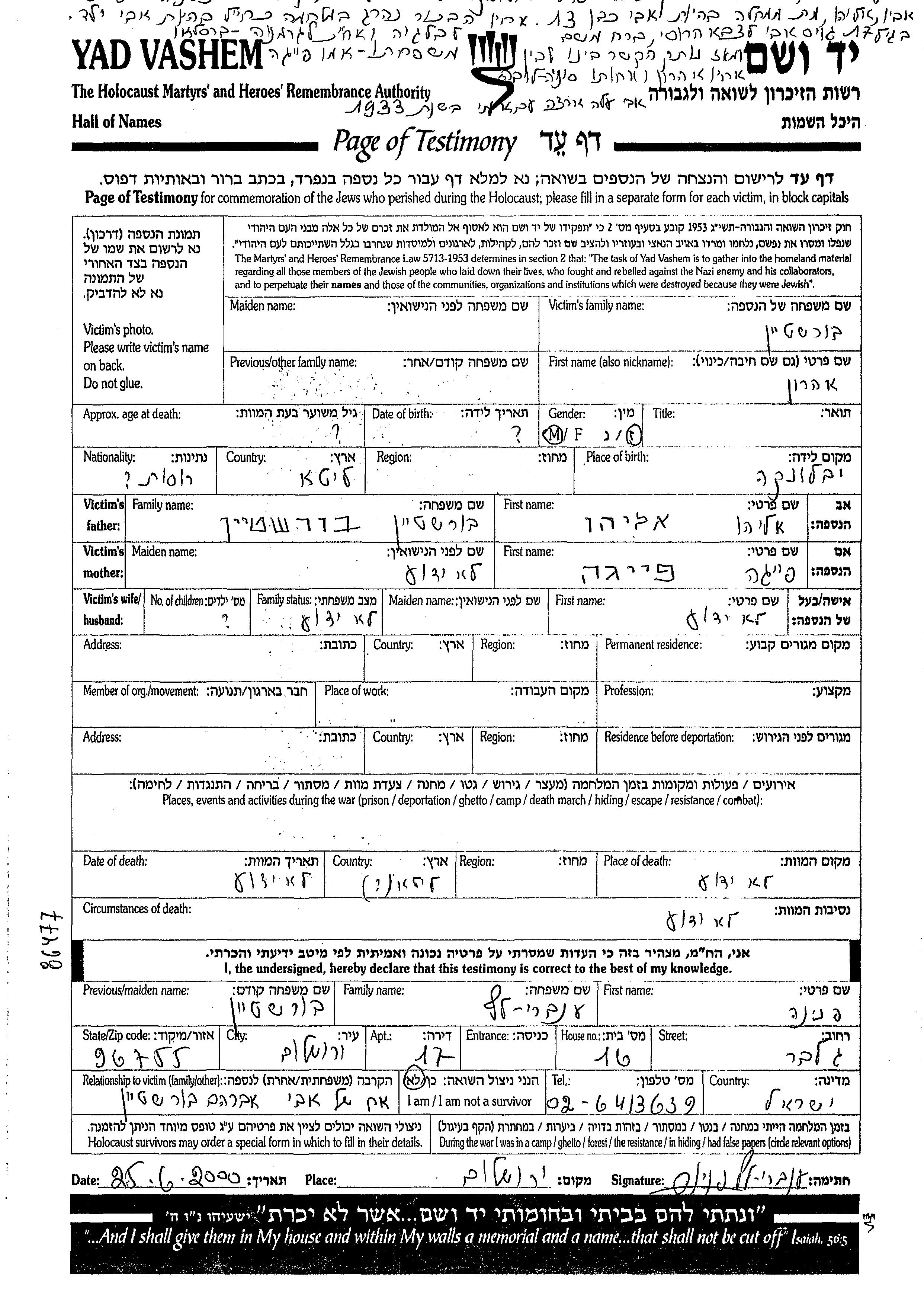 Burshtein Aharon unstated place, Page of Testimony