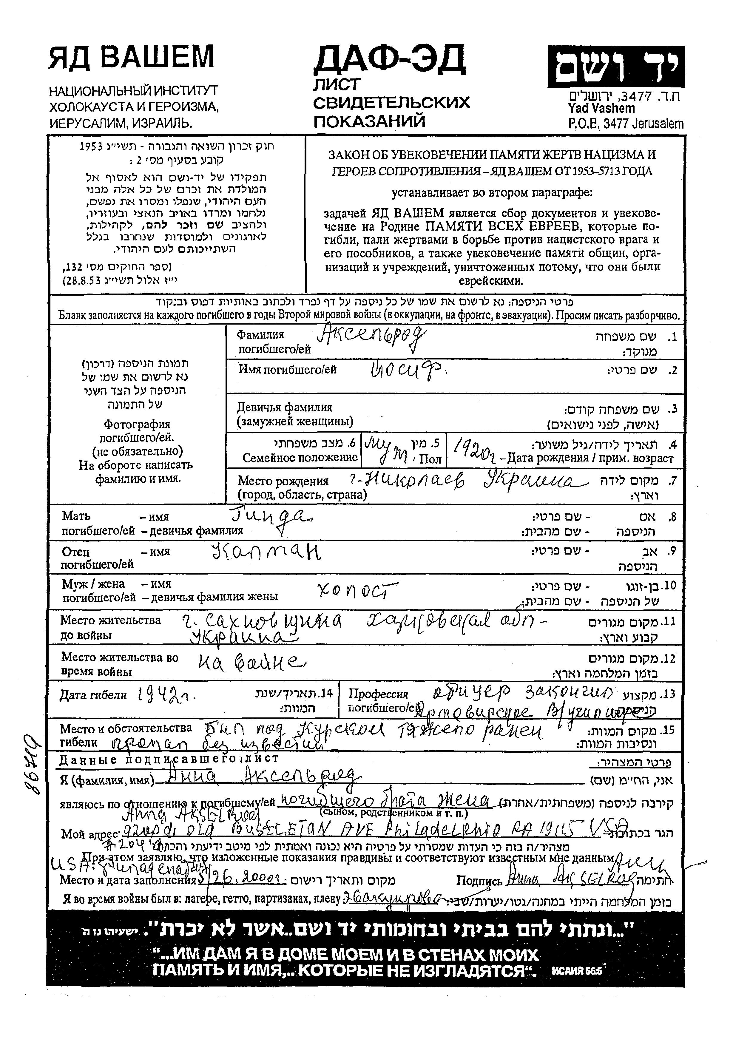 Iosif Akselrad was born in Nikolayev, Ukraine (USSR), 1920 to Kalman and Ginda. He was an officer. Prior to WWII he lived in Sakhnovshchina, Ukraine (USSR). During the war he was in the Soviet armed forces. Iosif was murdered in the Shoah. Place of death: Kursk, Russia (USSR), 1942.
