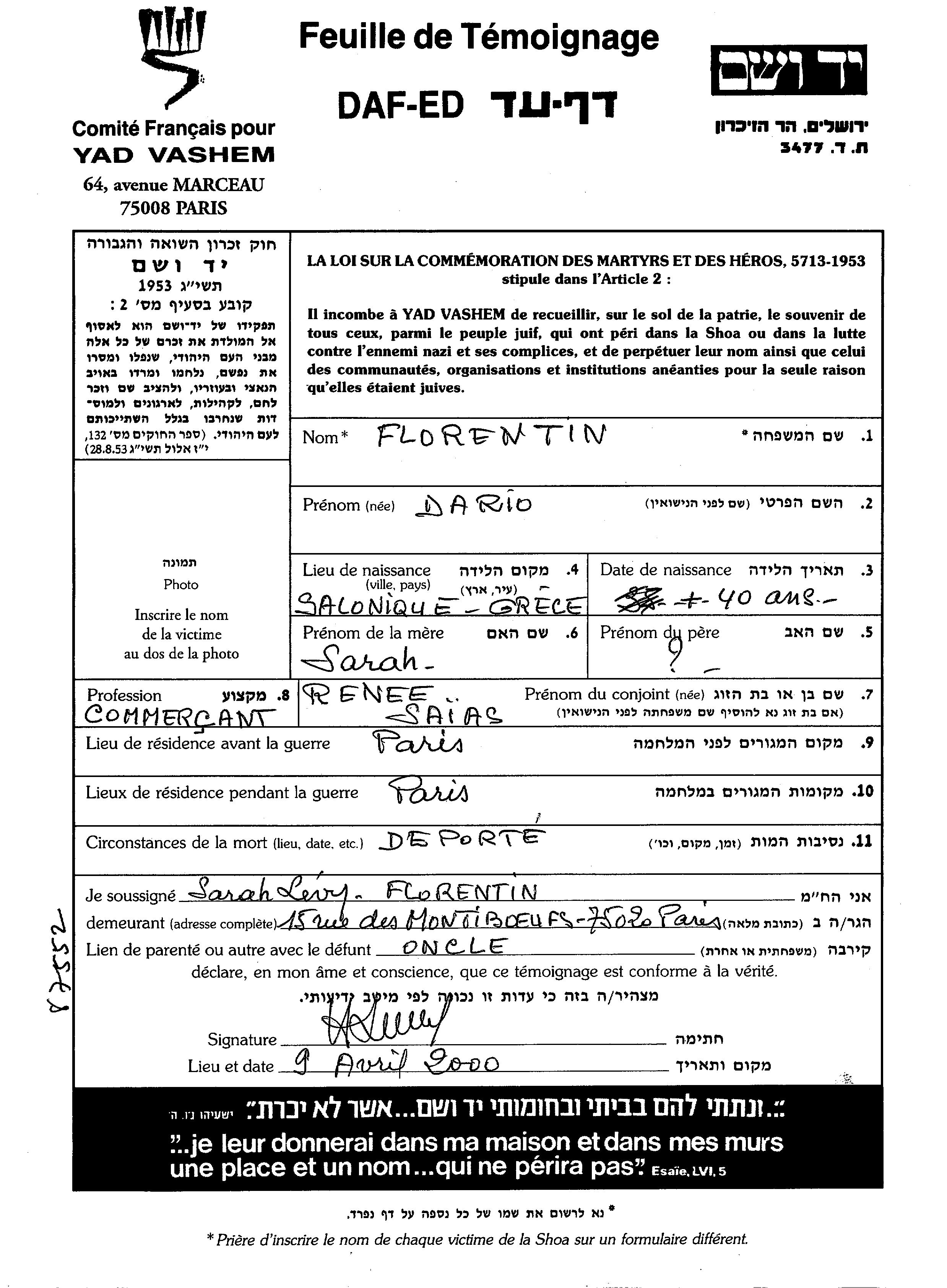 Florentin Dario Paris, France Page of Testimony