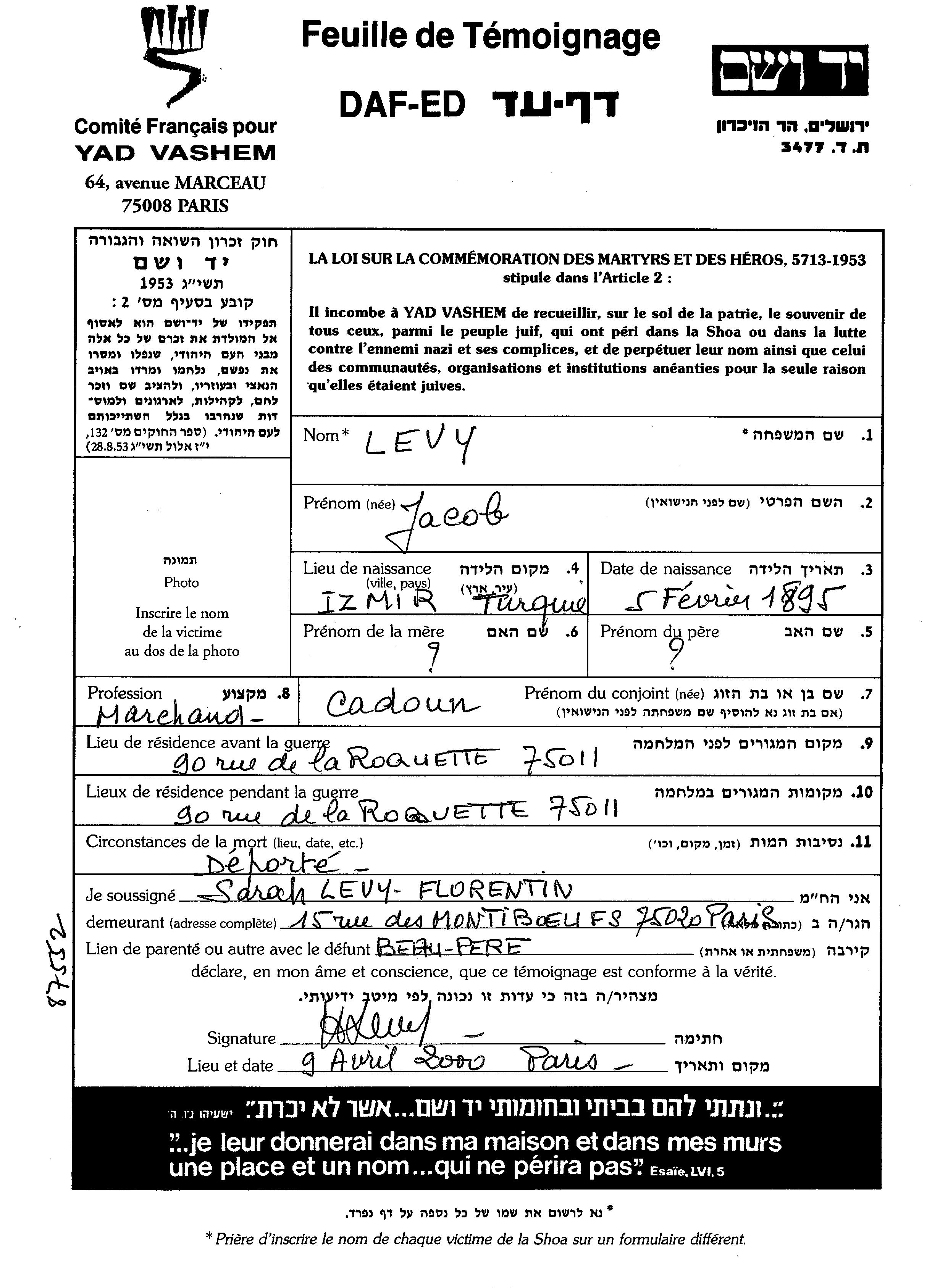 Jacob Levy was born in Izmir, Turkey, 1895. He was a merchant. Prior to WWII he lived in Paris, France. During the war he was in Paris, France.