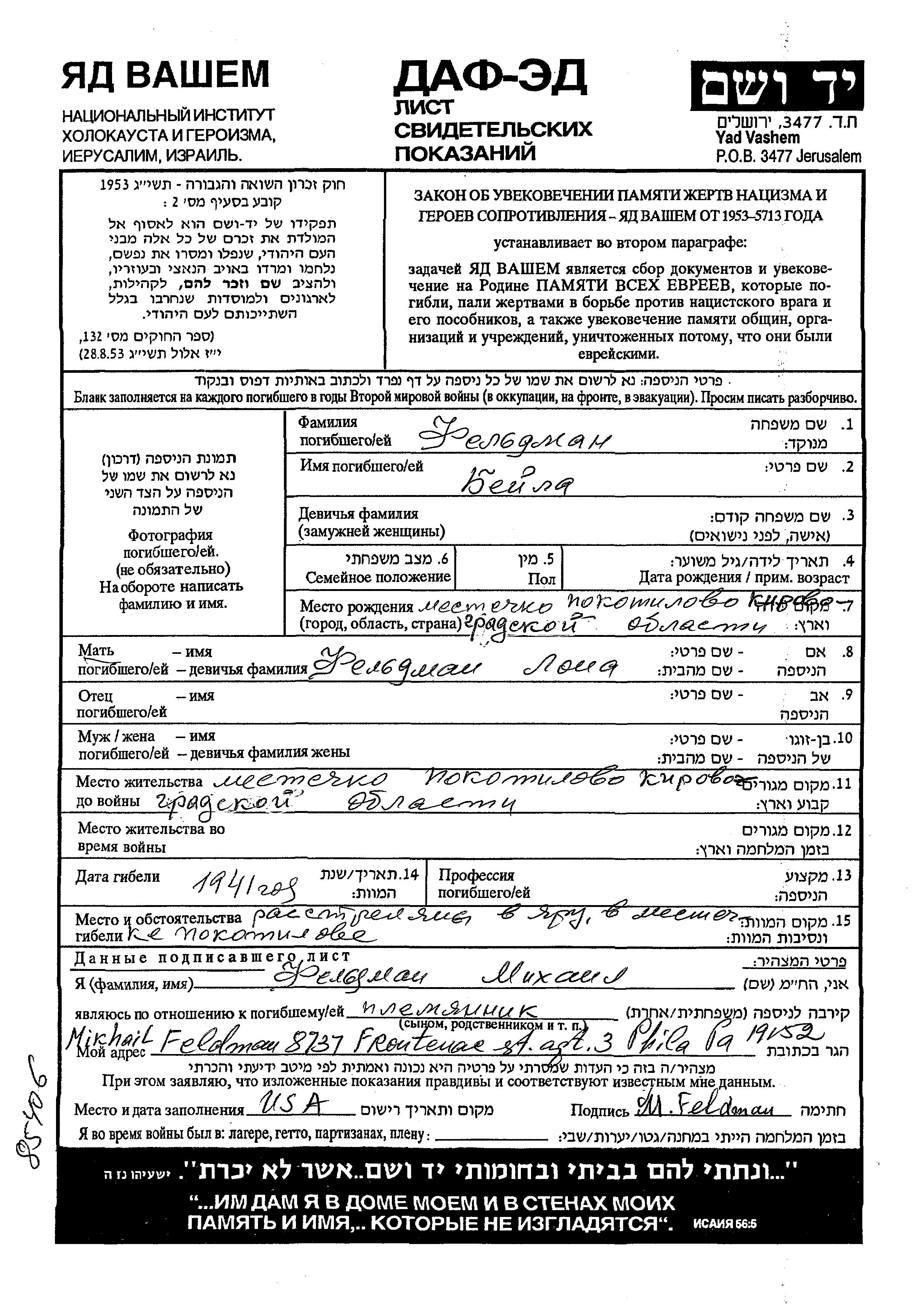 Beila Feldman was born in Pokotilovo, Ukraine (USSR) to Lona. Prior to WWII she lived in Pokotilovo, Ukraine (USSR). During the war she was in Pokotilovo, Ukraine (USSR). Beila was murdered in the Shoah. Place of death: Pokotilovo, Ukraine (USSR), 1941.