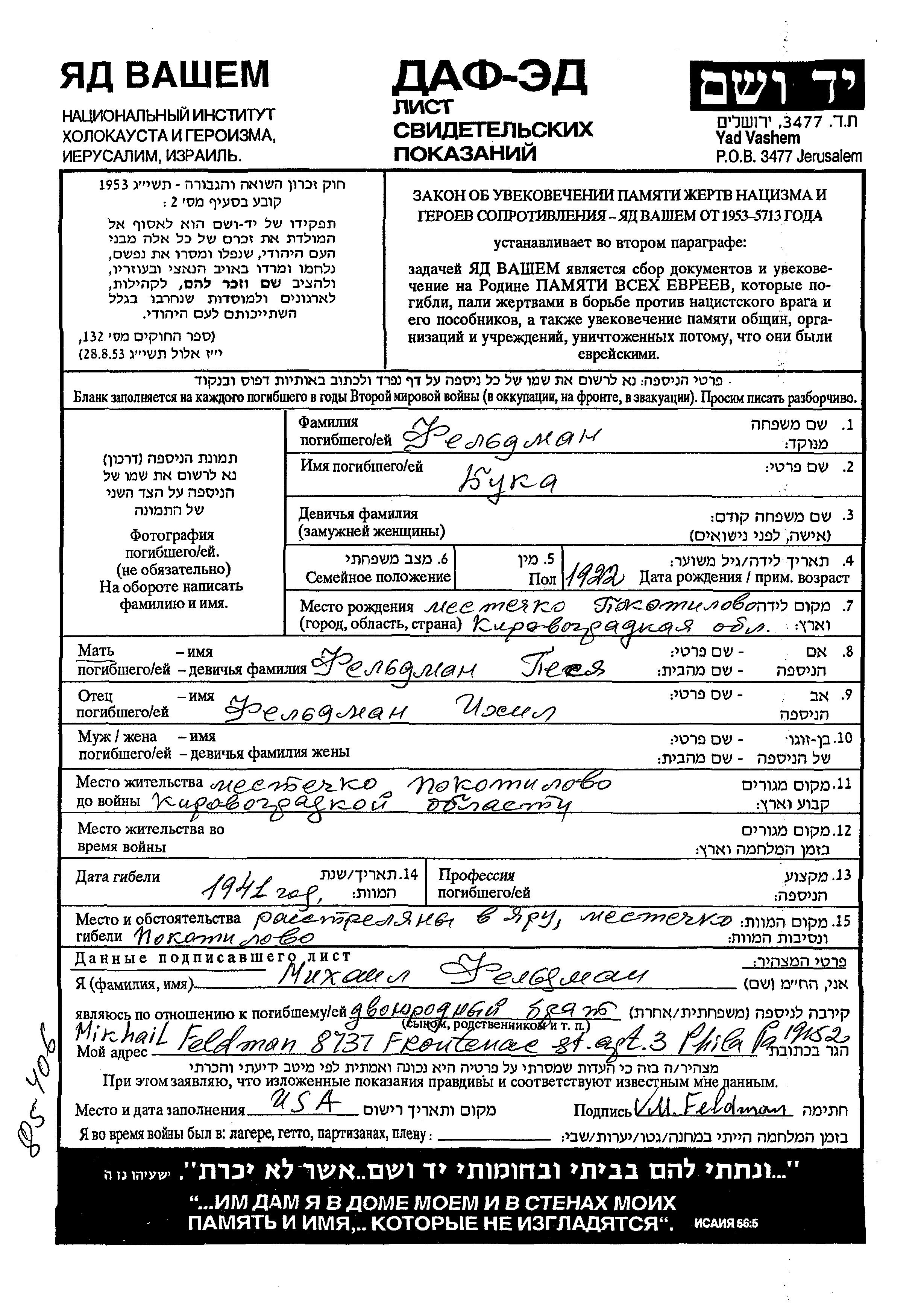 Buka Feldman was born in Pokotilovo, Ukraine (USSR), 1922 to Ikhil and Pesya. Prior to WWII she lived in Pokotilovo, Ukraine (USSR). Buka was murdered in the Shoah. Place of death: Pokotilovo, Ukraine (USSR), 1941.
