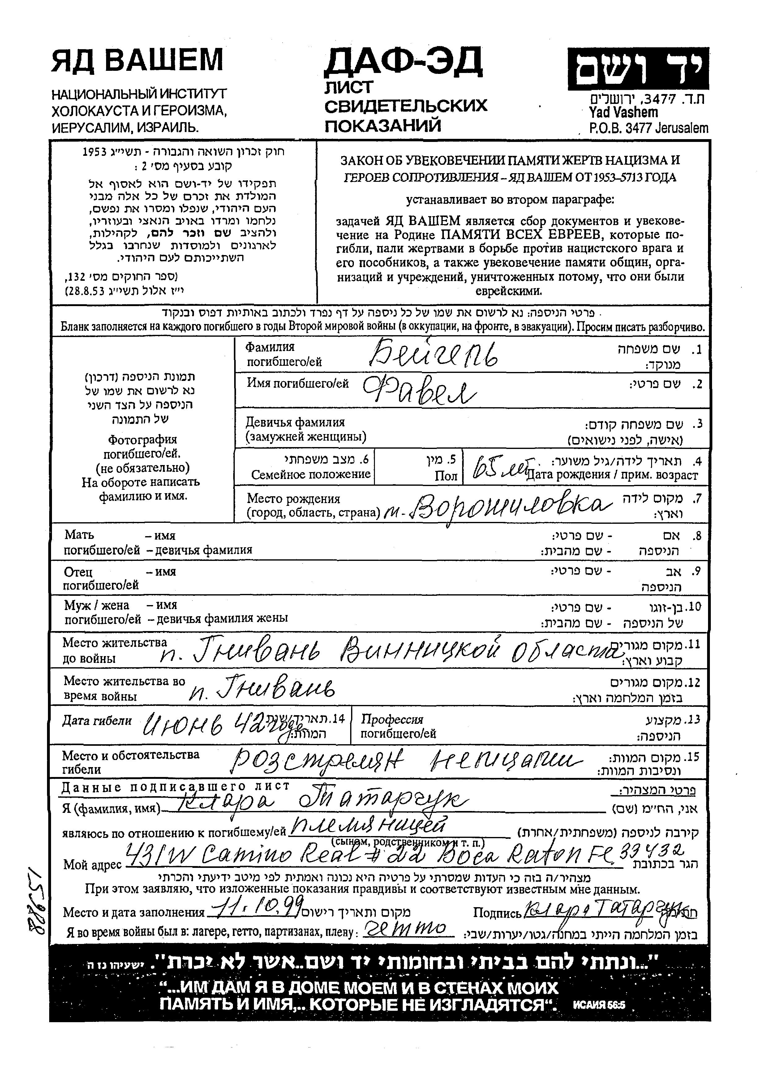 Favel Beigel was born in Voroshilovka, Ukraine (USSR). Prior to WWII he lived in Gnivan, Ukraine (USSR). During the war he was in Gnivan, Ukraine (USSR). Favel was murdered in the Shoah. Place of death: unknown, 1942.