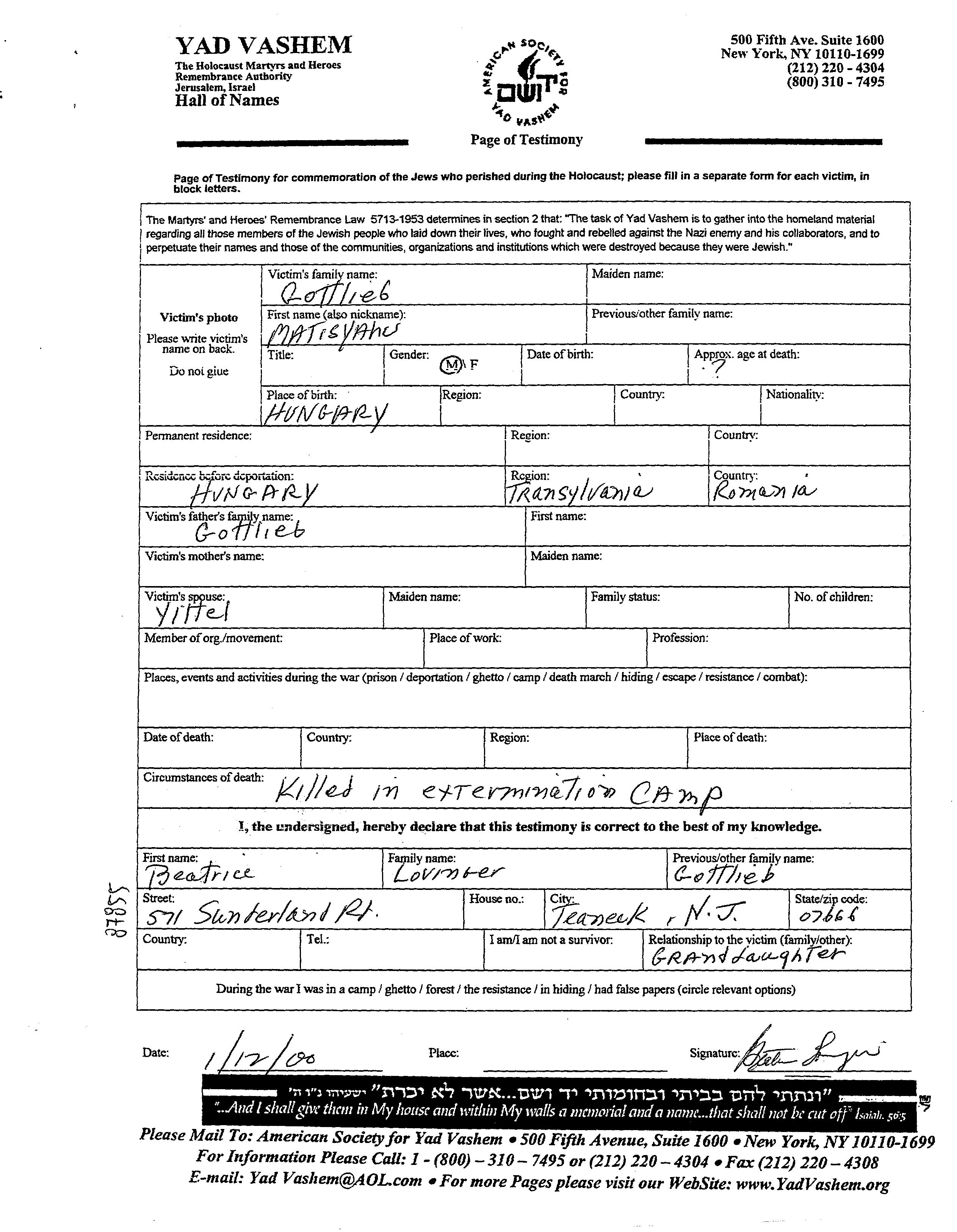 Gottlieb Matisyahu Romania Page of Testimony