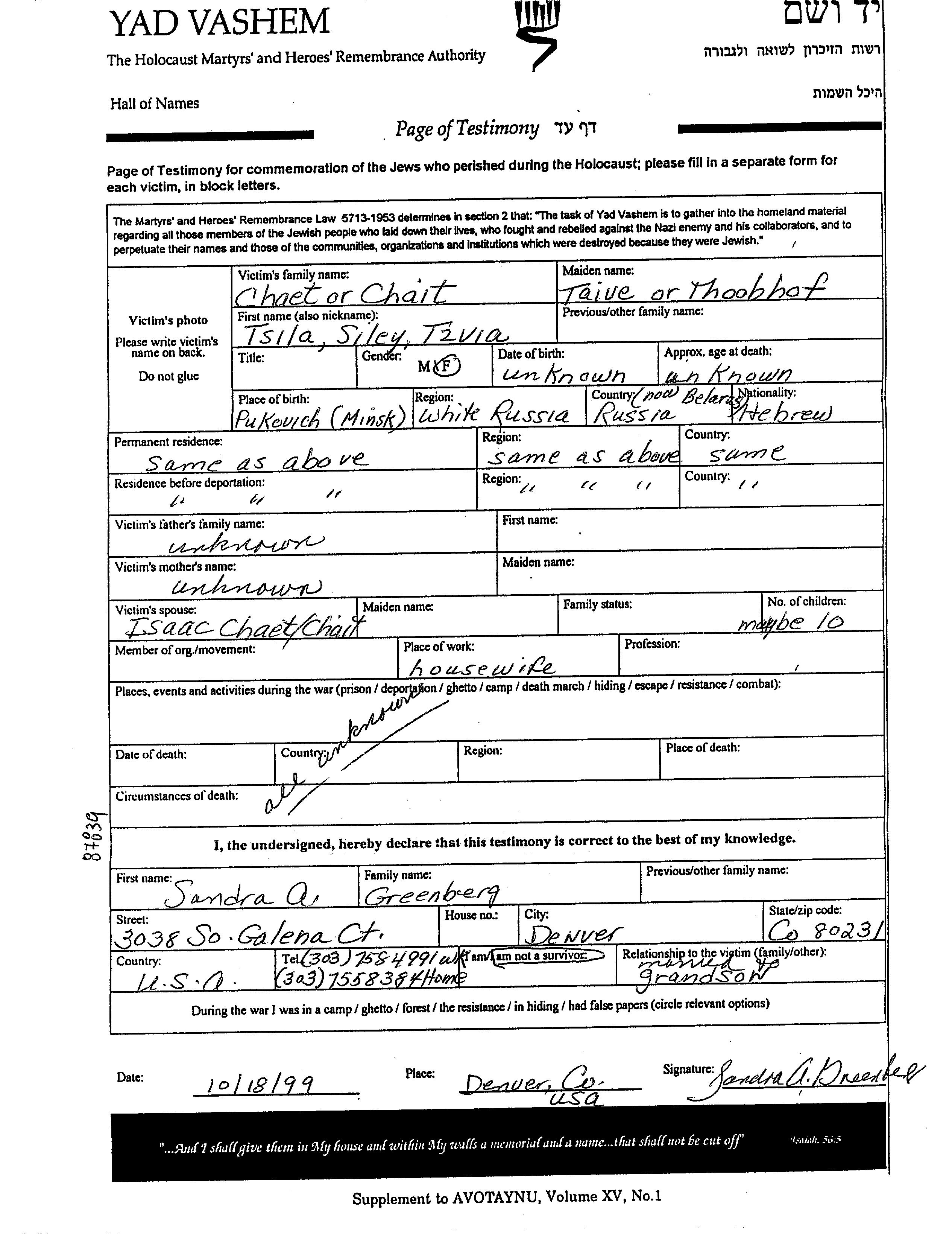 Chaet Tsila Tzvia Pukhovichi, Belorussia (USSR) Page of Testimony