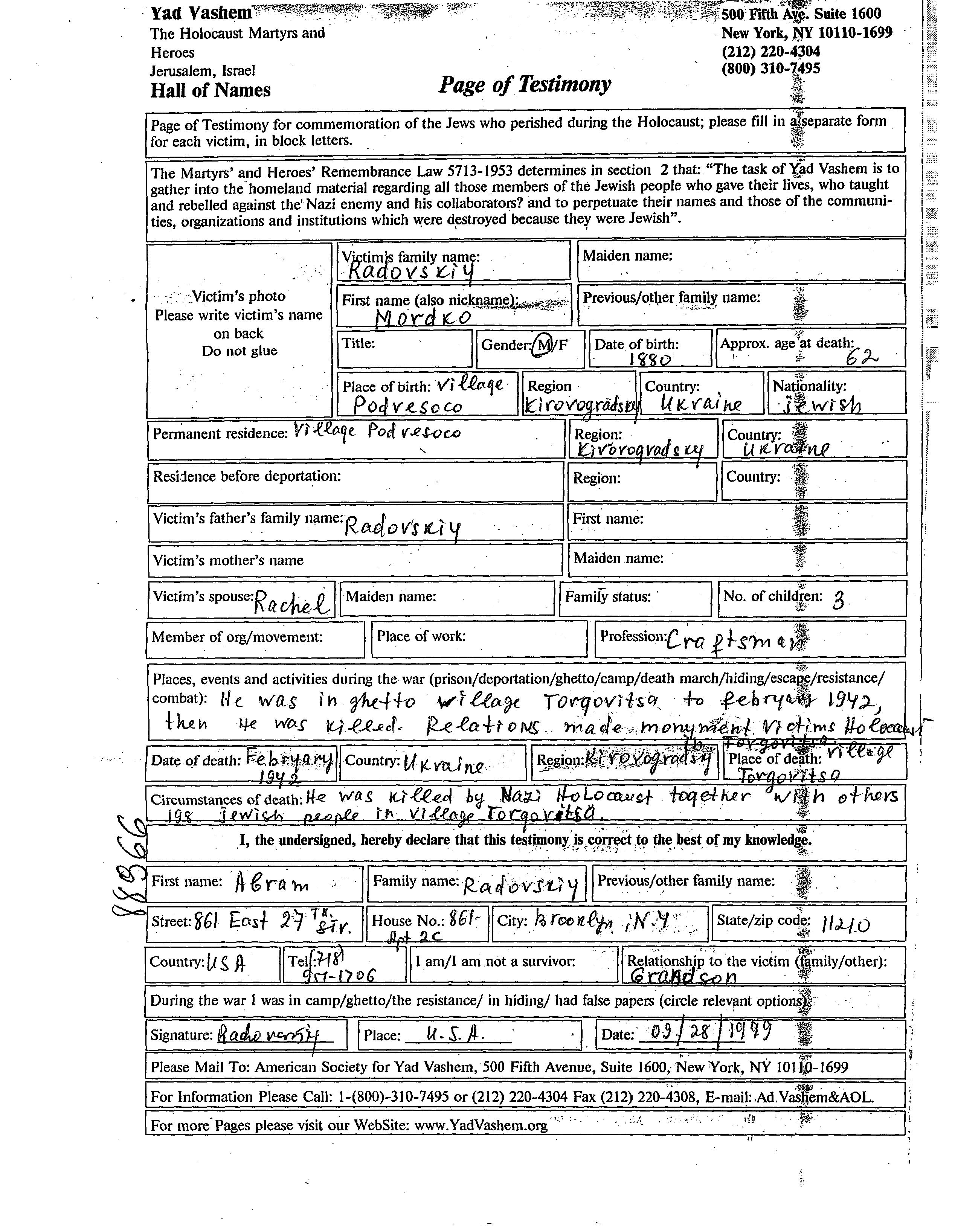 Mordko Radovskiy was born in Podvysokoye, Ukraine (USSR), 1880. He was a craftsman and married to Rachel. Prior to WWII he lived in Podvysokoye, Ukraine (USSR). Mordko was murdered in the Shoah. Place of death: Torgovitsa, Ukraine (USSR), 1942.