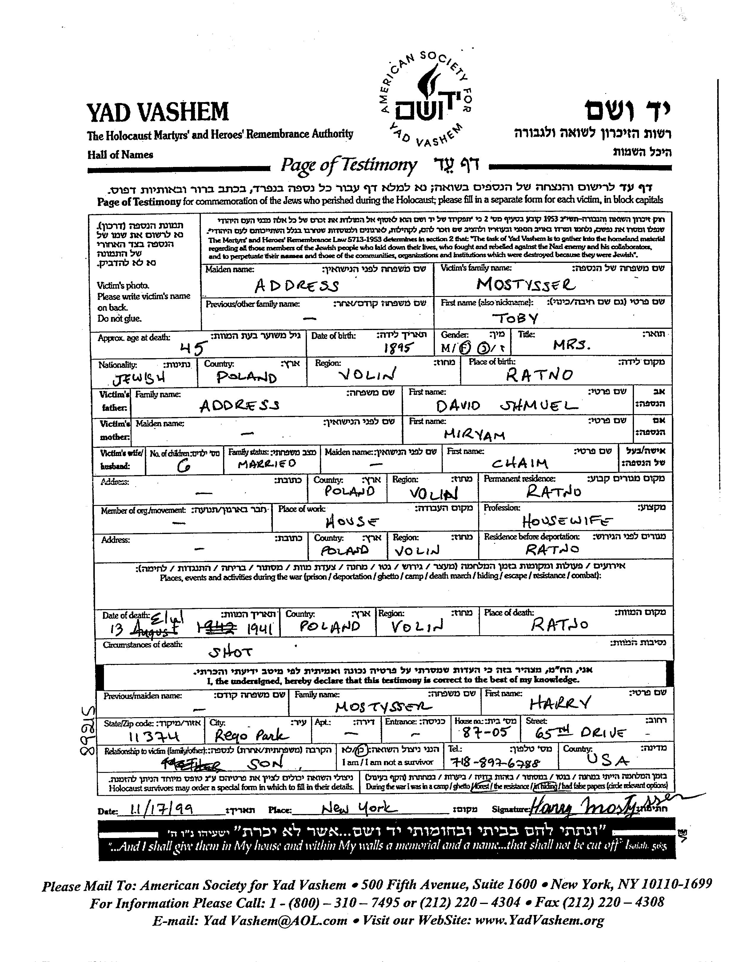 Mostysser Toby 1895 Ratno, Poland Page of Testimony