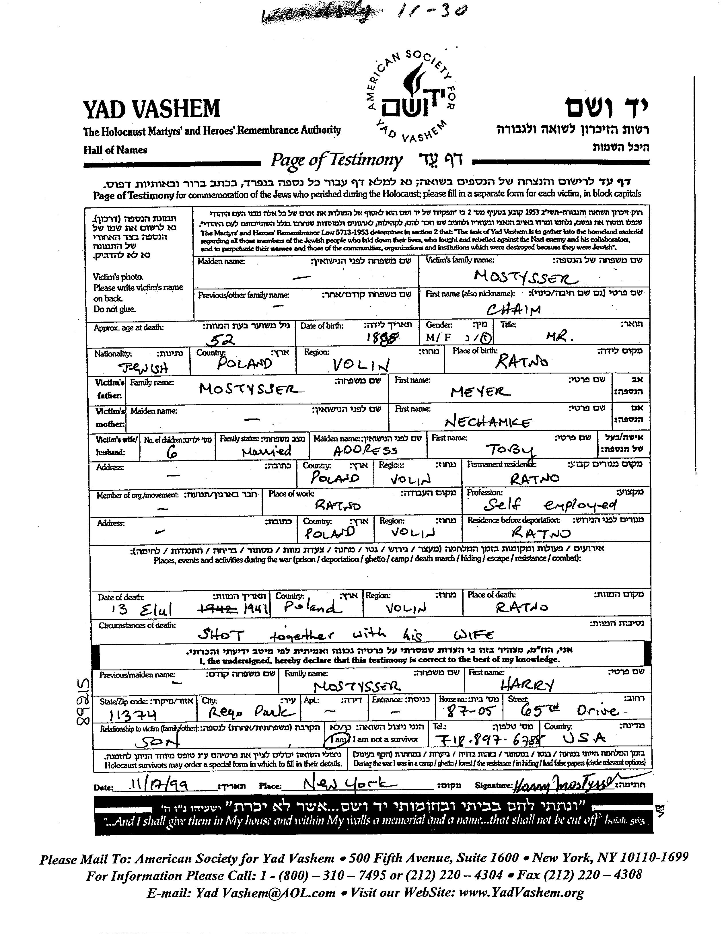 Mostysser Chaim 1888 Ratno, Poland Page of Testimony