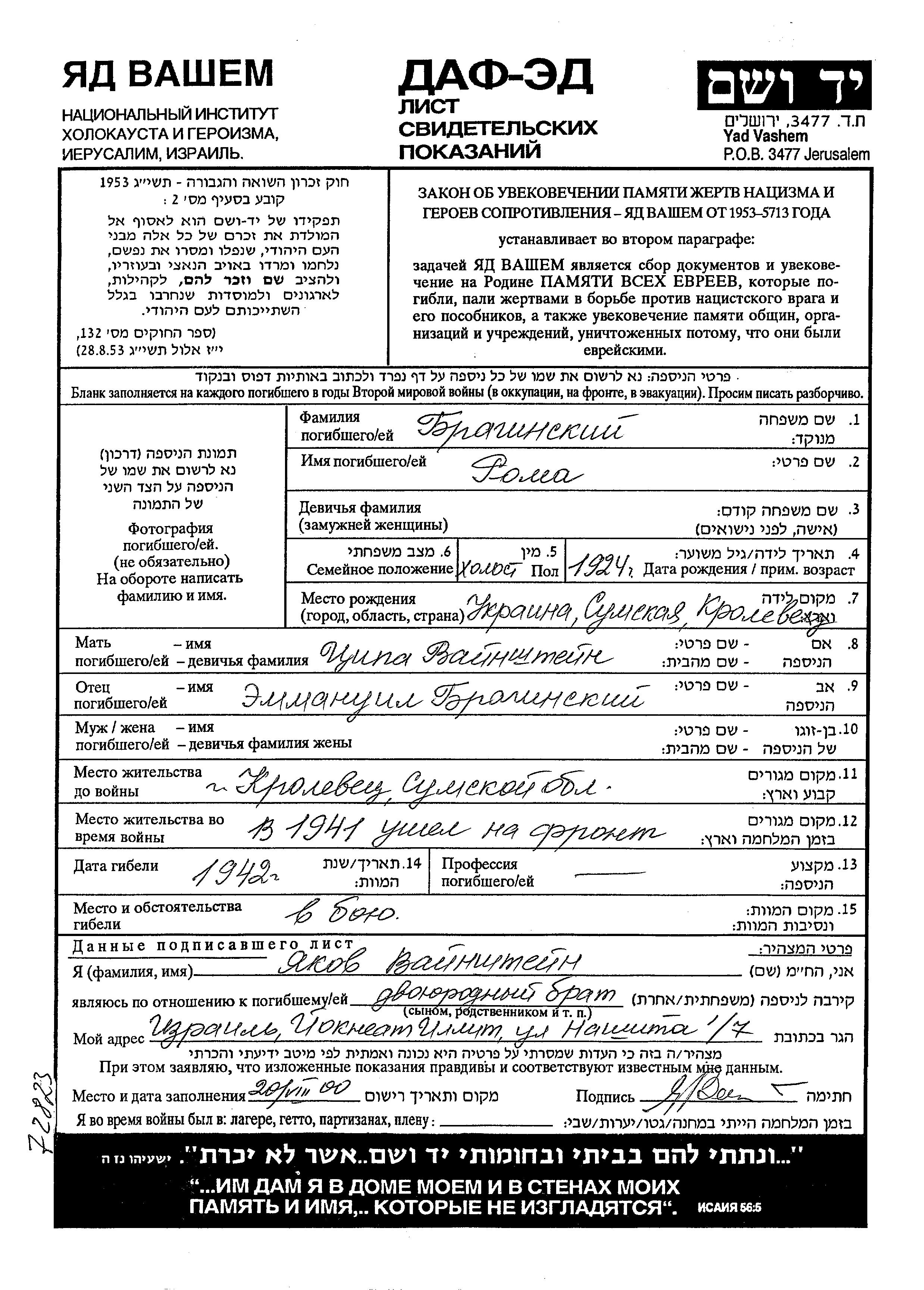 Roma Braginski was born in Krolevets, Ukraine (USSR), 1924 to Emmanuil and Tzipa. He was single. Prior to WWII he lived in Krolevets, Ukraine (USSR). During the war he was in the Soviet armed forces. Roma was killed in military service in WWII. Place of death: unknown, 1942.