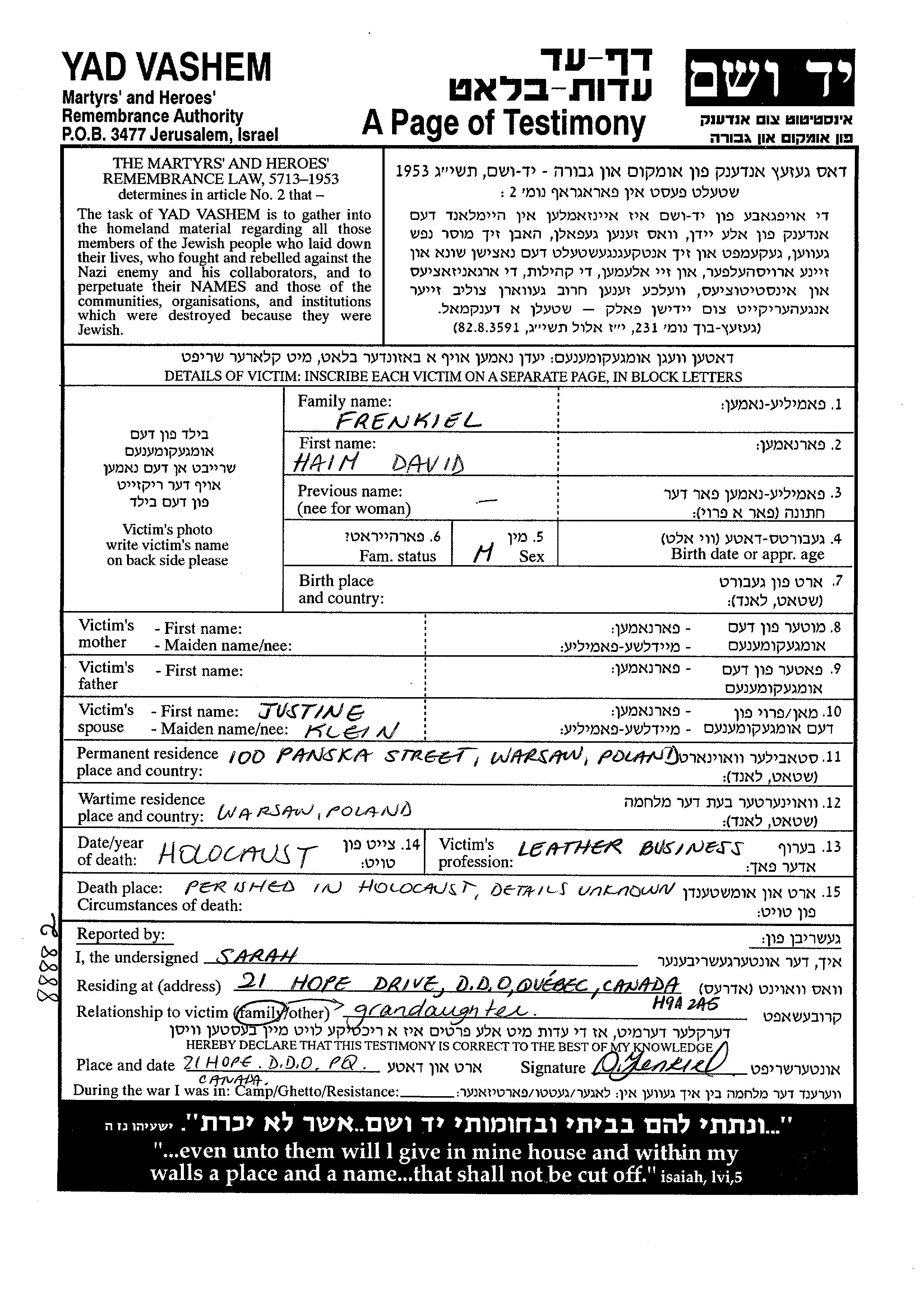 Frenkiel Haim David Warszawa, Poland Page of Testimony
