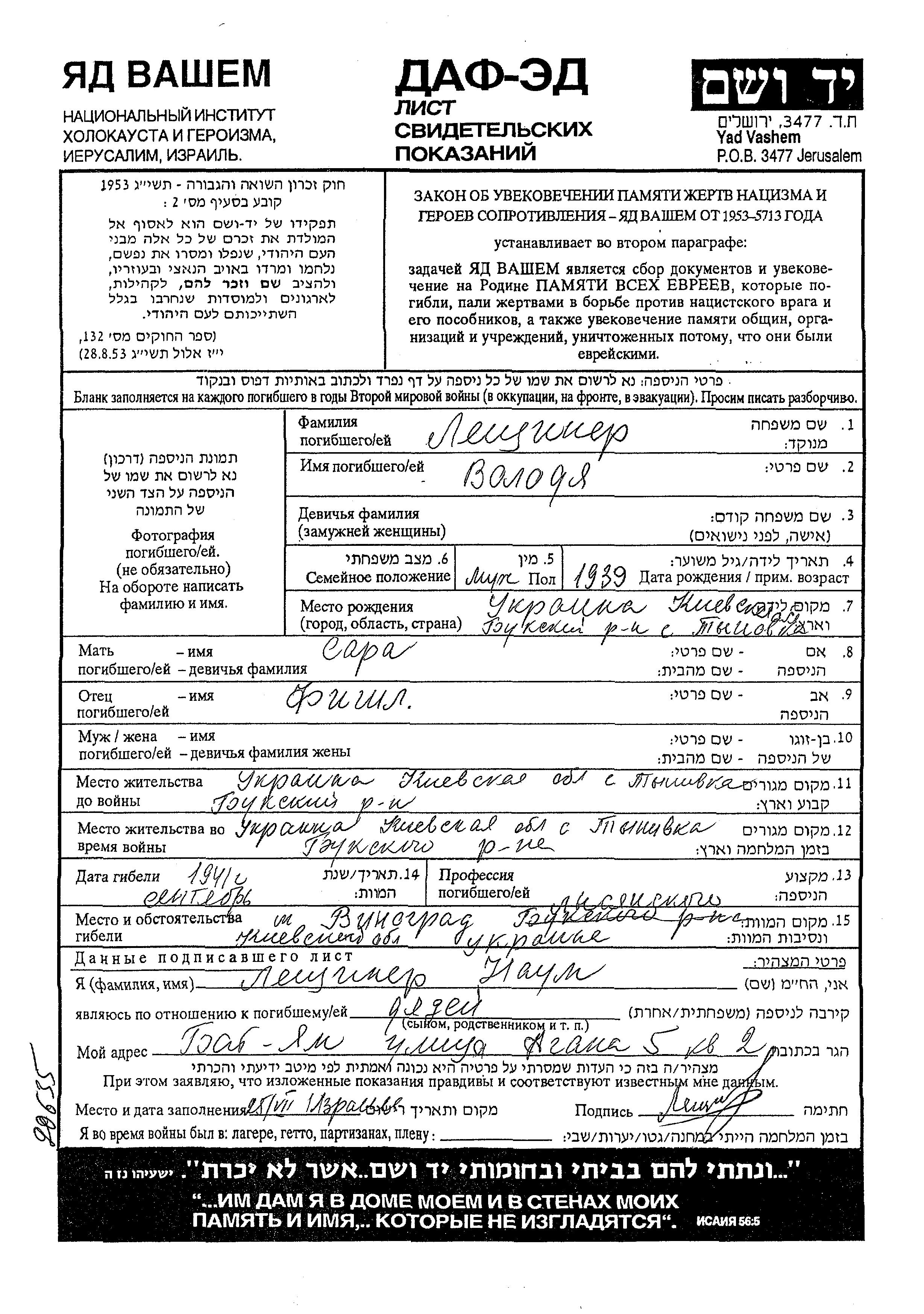 Leshchiner Volodya 1939 Tynovka, Ukraine (USSR) Page of Testimony
