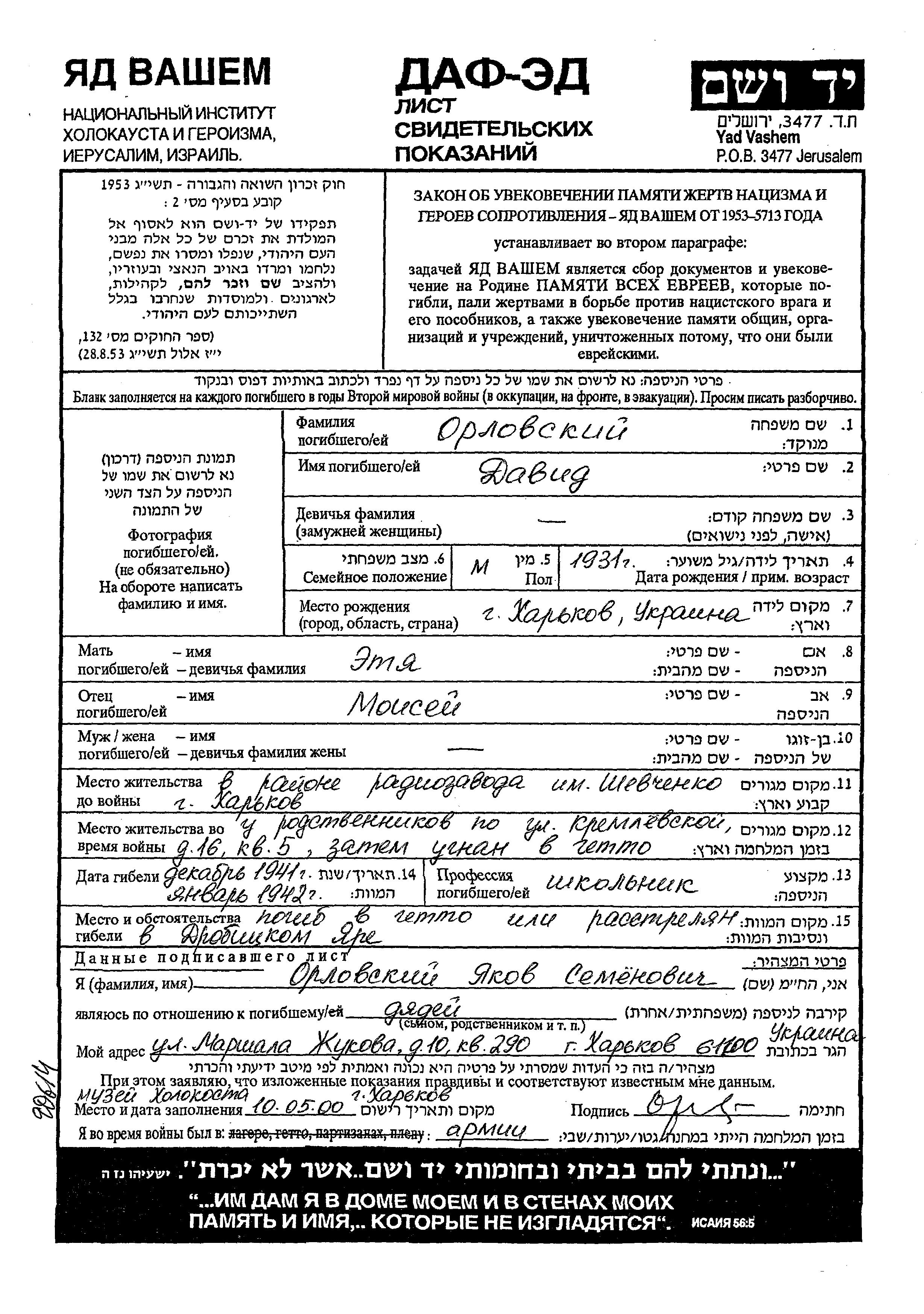 Orlovski David 1931 Kharkov, Ukraine (USSR) Page of Testimony