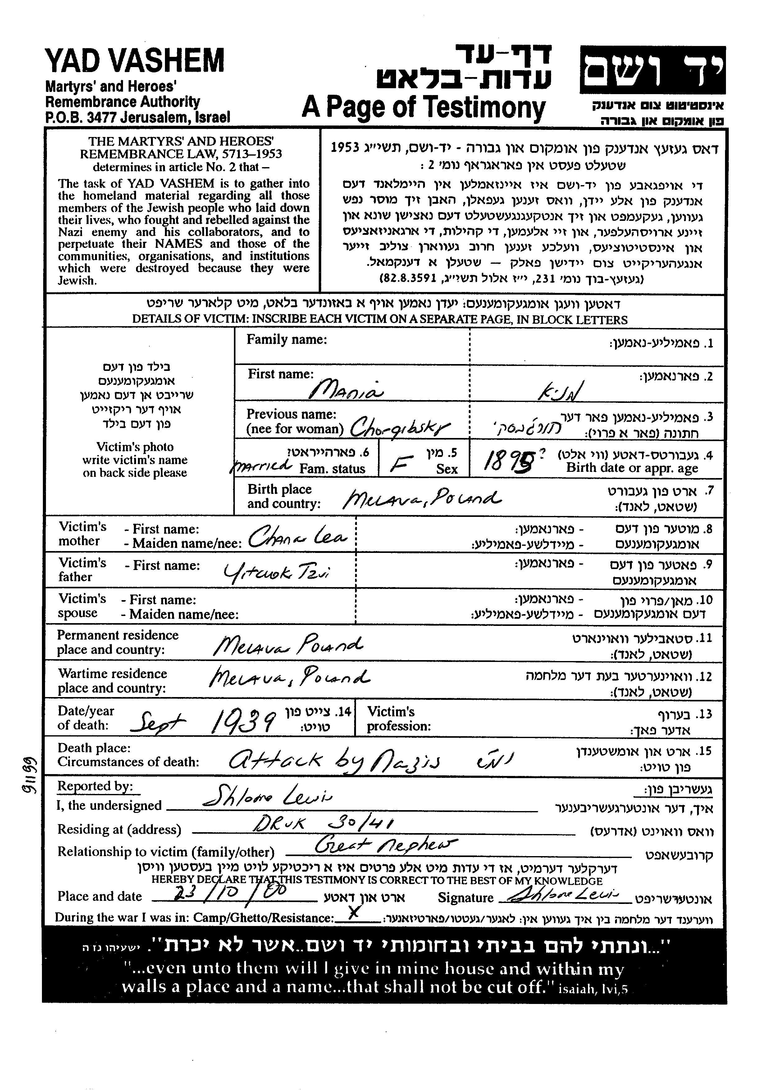 Mania Surname unknown nee Chorgibsky was born in Melava, Poland, 1895 to Yitzhok Tzvi and Chana Lea. Was married. Prior to WWII lived in Melava, Poland. During the war was in Melava, Poland. Mania was murdered in the Shoah. Place of death: Melava, Poland, 1939.