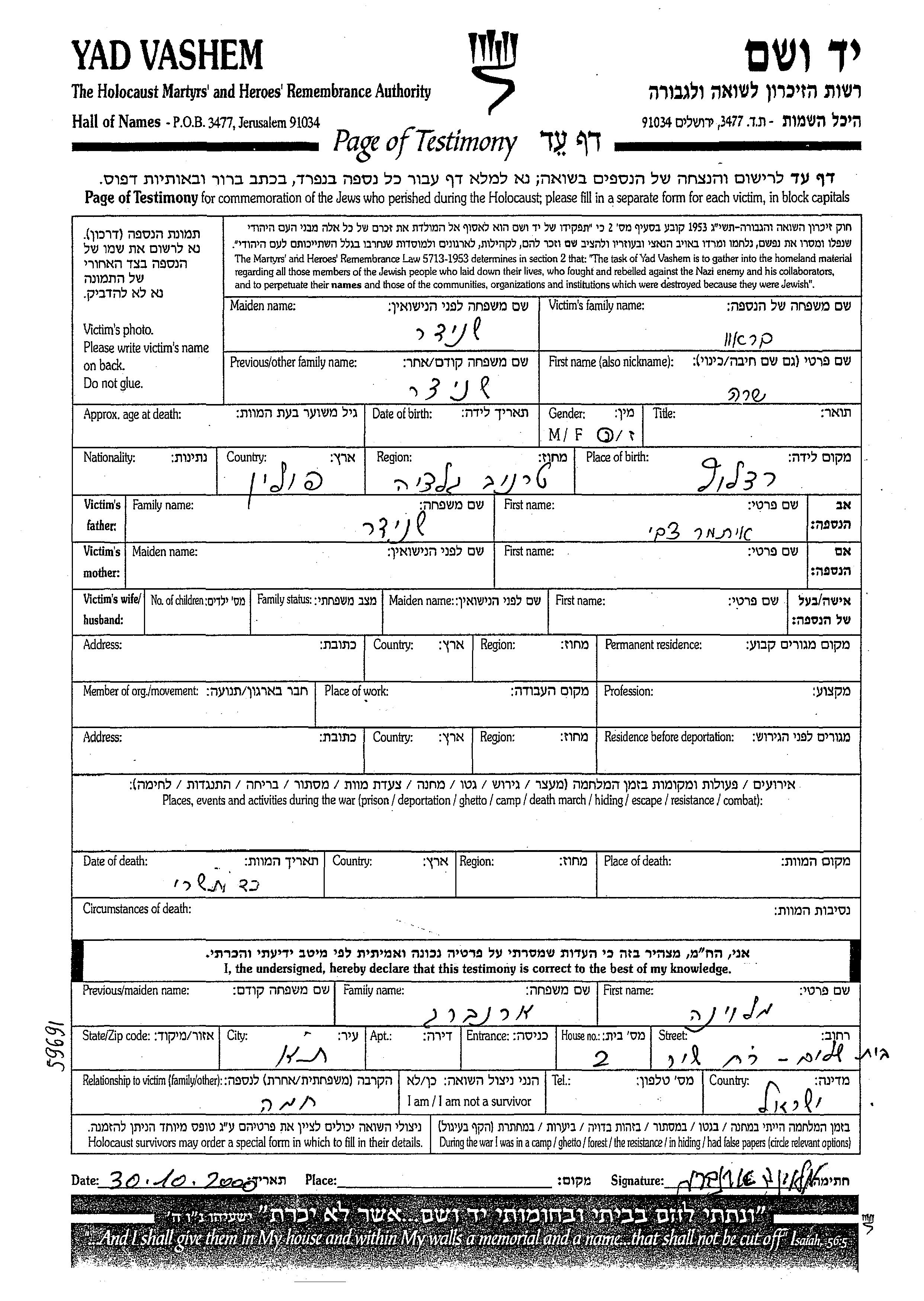 Yad Vashem - Pages of Testimony Names Memorial Collection
