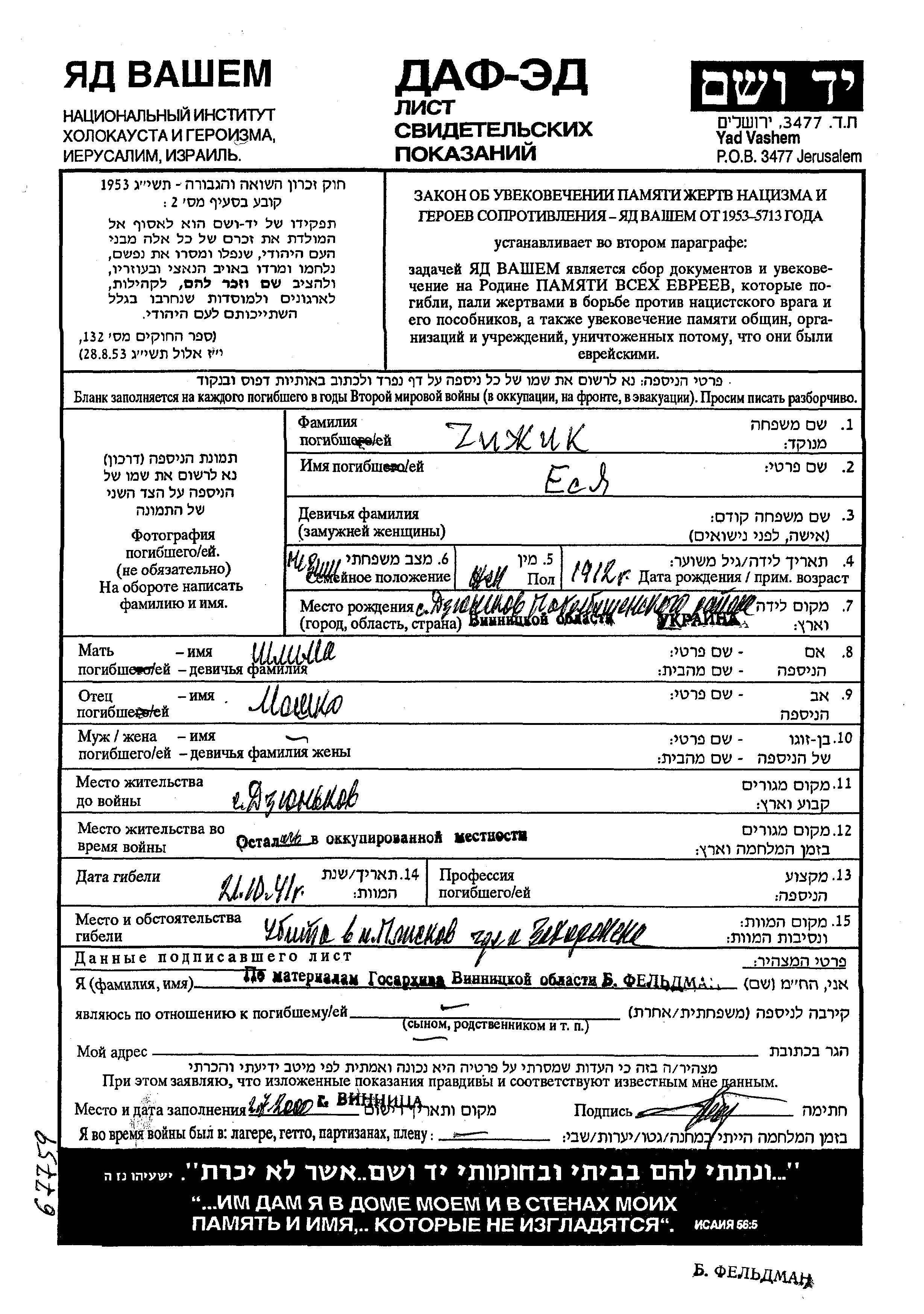 Yesya Chizhik was born in Dzyunkov, Ukraine (USSR), 1912 to Moshko and Shlima. Prior to WWII he lived in Dzyunkov, Ukraine (USSR). Yesya was murdered in the Shoah. Place of death: Pliskov, Ukraine (USSR), 1941.
