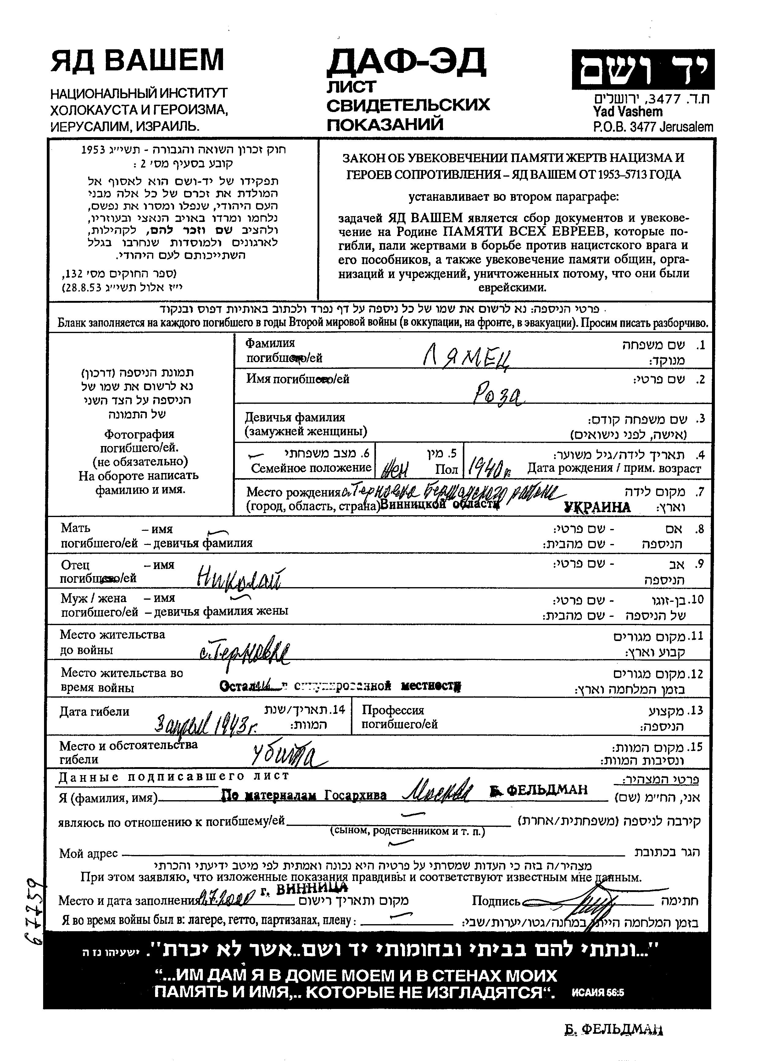 Roza Lyametz was born in Ternovka, Ukraine (USSR), 1940 to Nikolay. Prior to WWII she lived in Ternovka, Ukraine (USSR). Roza was murdered in the Shoah. Place of death: unknown, 1943.