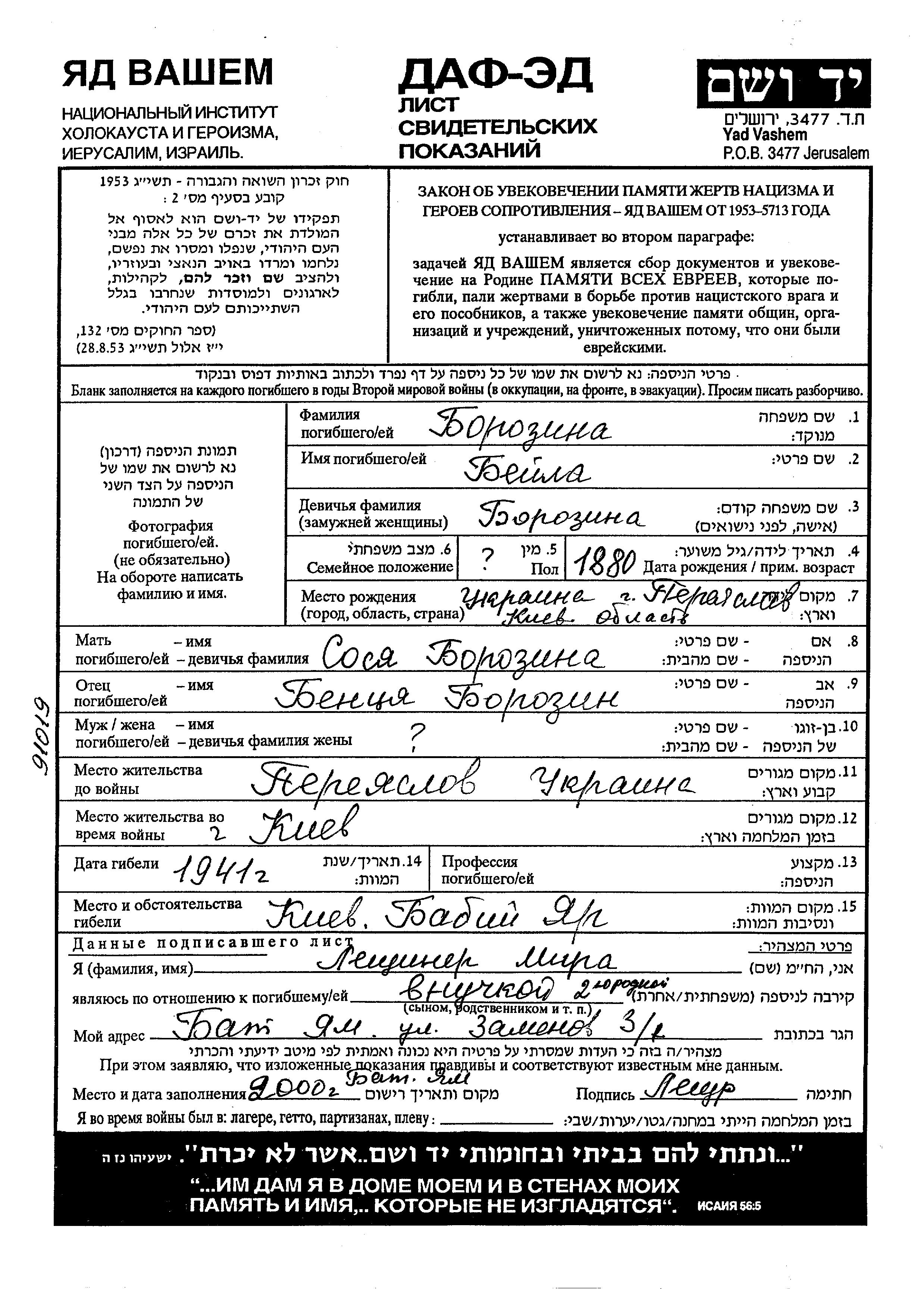 Borozina Beila 1880 Pereyaslav, Ukraine (USSR) Page of Testimony
