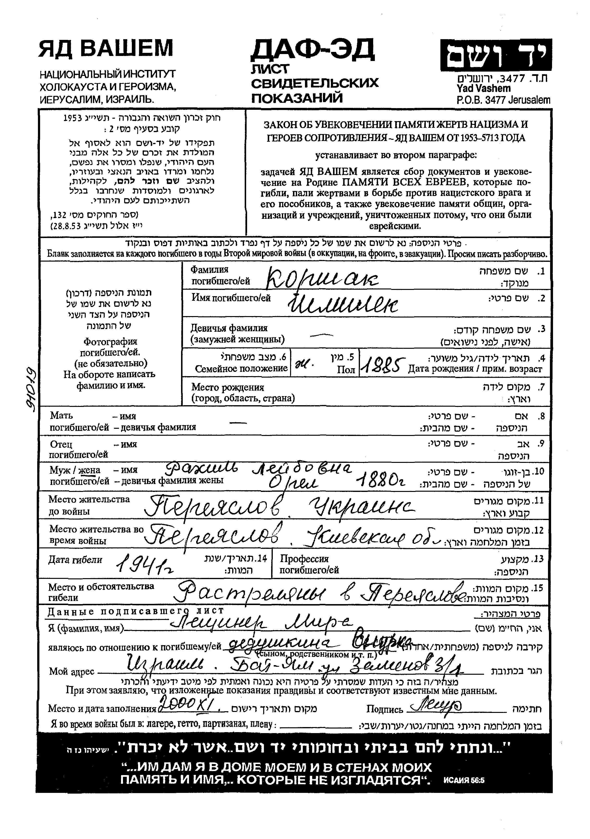 Korshak Shmilek 1885 Pereyaslav, Ukraine (USSR) Page of Testimony