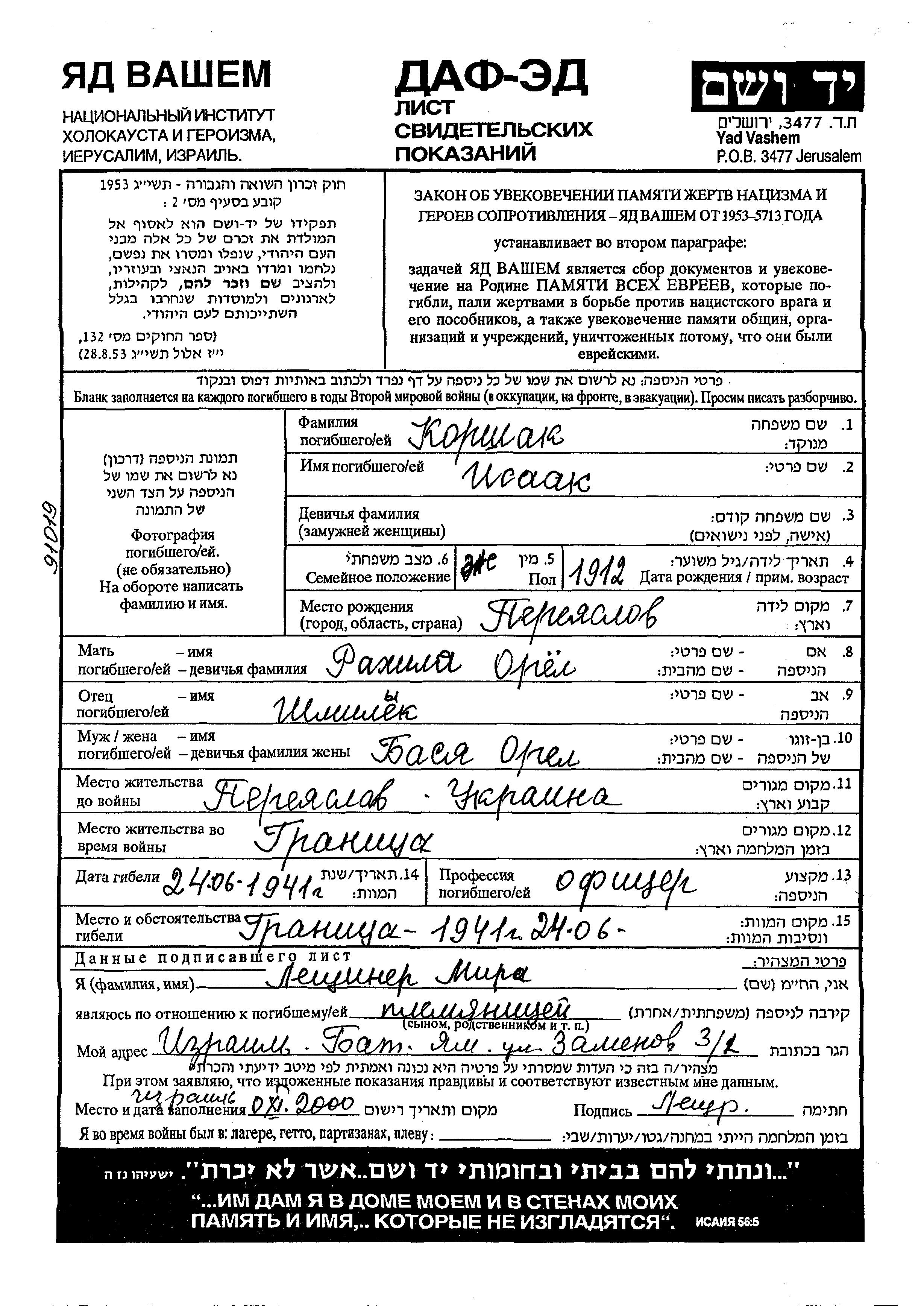 Isaak Korshak was born in Pereyaslav, Ukraine (USSR), 1912 to Shmilyk and Rakhila. He was an officer. Prior to WWII he lived in Pereyaslav, Ukraine (USSR). During the war he was in the Soviet armed forces. Isaak was killed in military service in WWII. Place of death: unknown, 1941.
