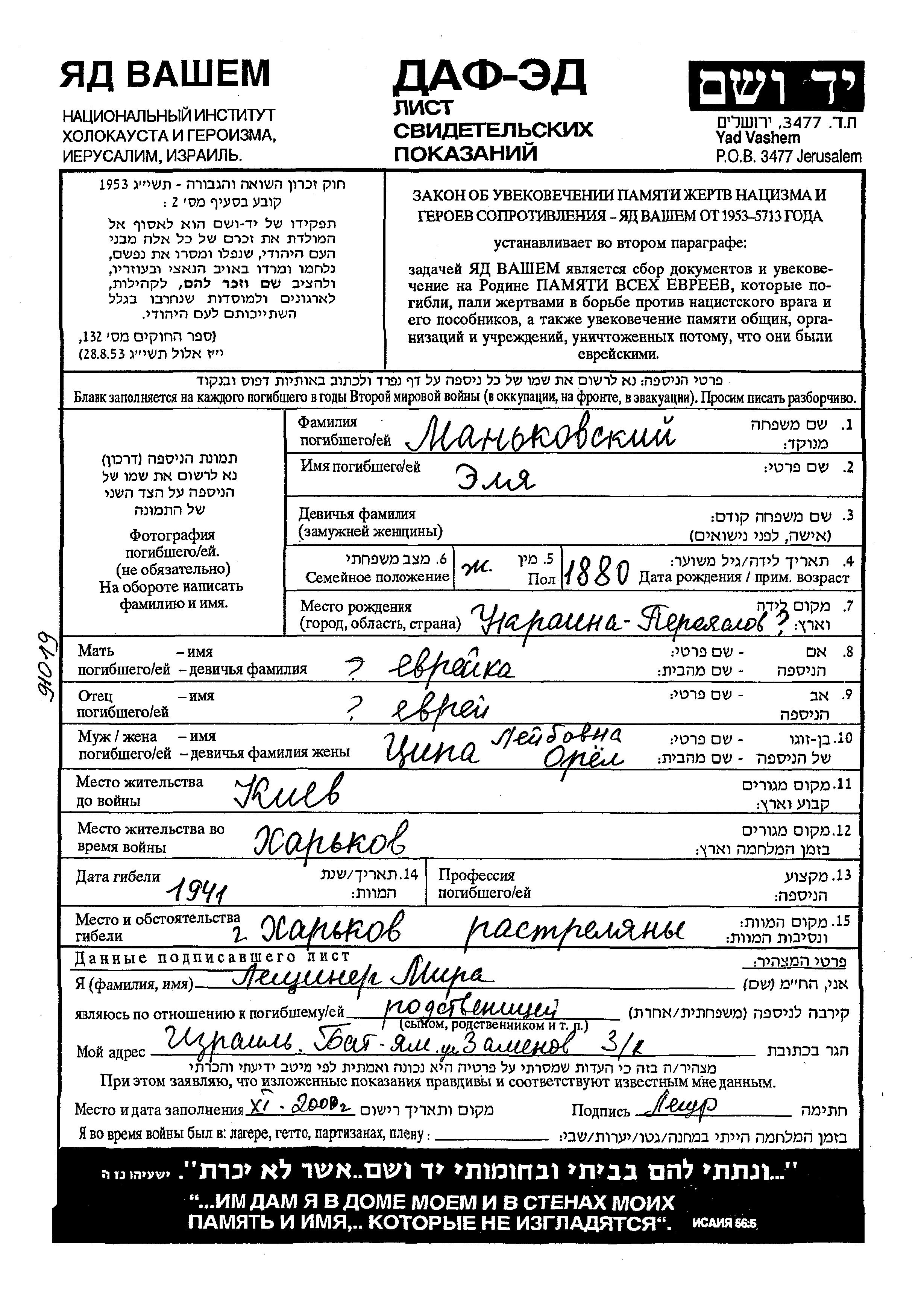 Mankovski Lya 1880 Kiyev, Ukraine (USSR) Page of Testimony