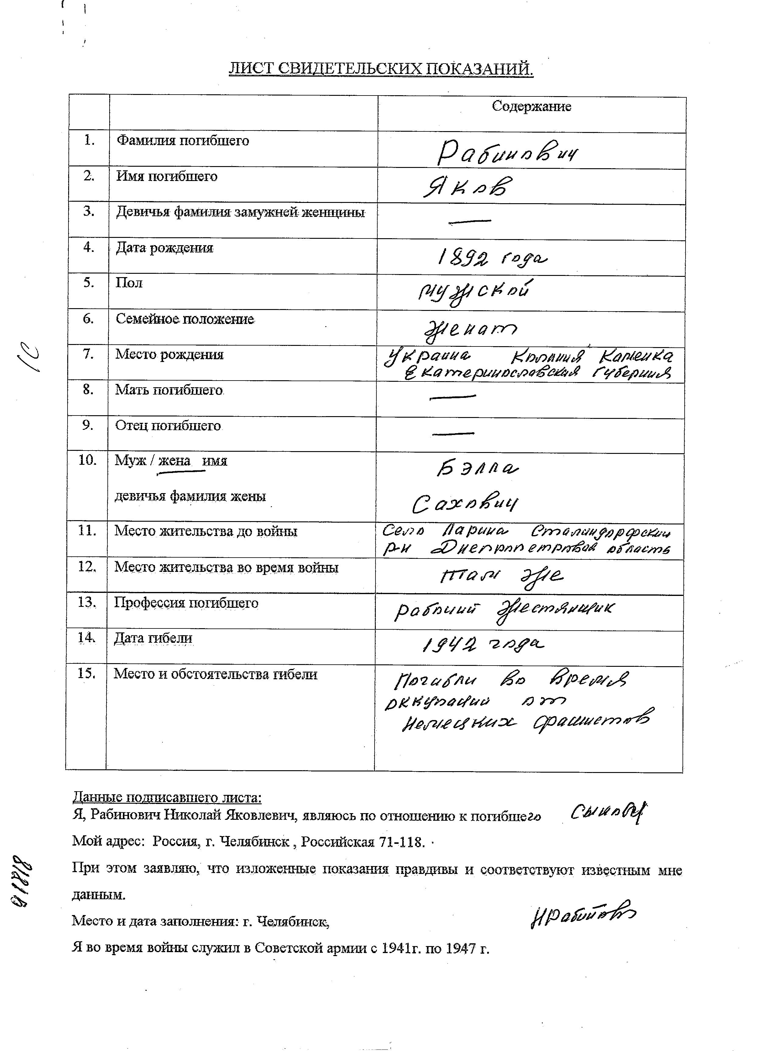 Yakov Rabinovich was born in Kamenka, Ukraine (USSR), 1892. He was a tinsmith and married to Bella nee Sakhovich. Prior to WWII he lived in Larino, Ukraine (USSR). During the war he was in Larino, Ukraine (USSR). Yakov was murdered in the Shoah. Place of death: Larino, Ukraine (USSR), 1942.
