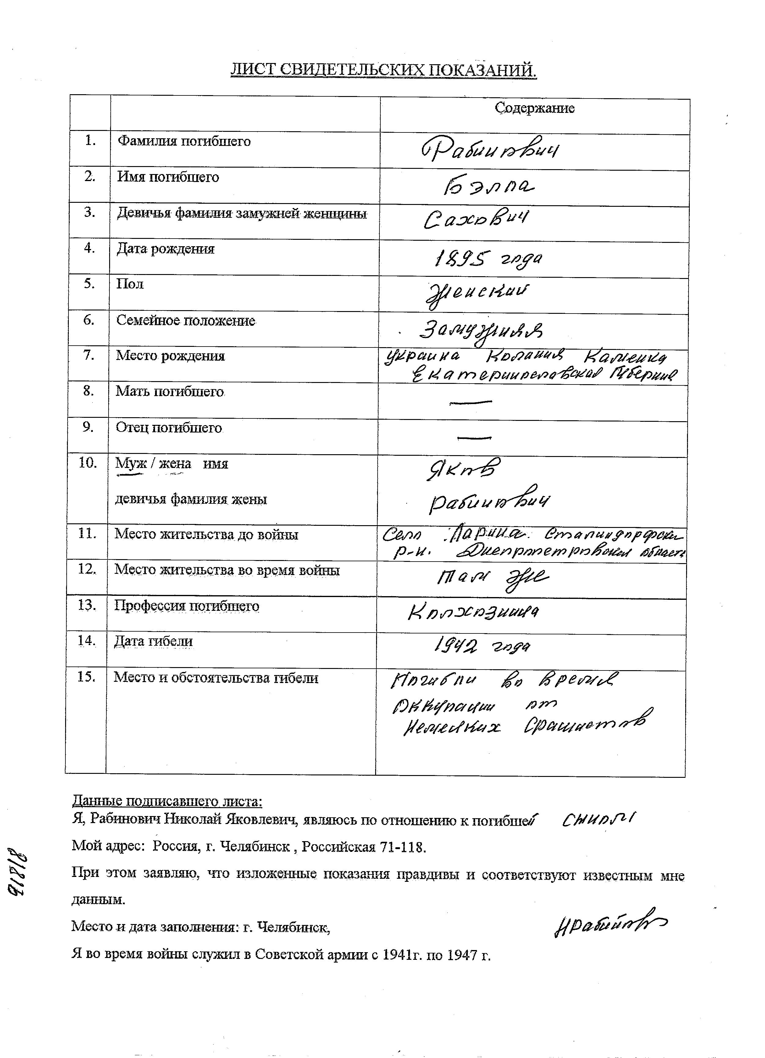Bella Rabinovich nee Sakhovich was born in Kamenka, Ukraine (USSR), 1895. She was a kolkhoznik / kolkhoznitza and married to Yakov. Prior to WWII she lived in Larino, Ukraine (USSR). During the war she was in Larino, Ukraine (USSR). Bella was murdered in the Shoah. Place of death: Larino, Ukraine (USSR), 1942.