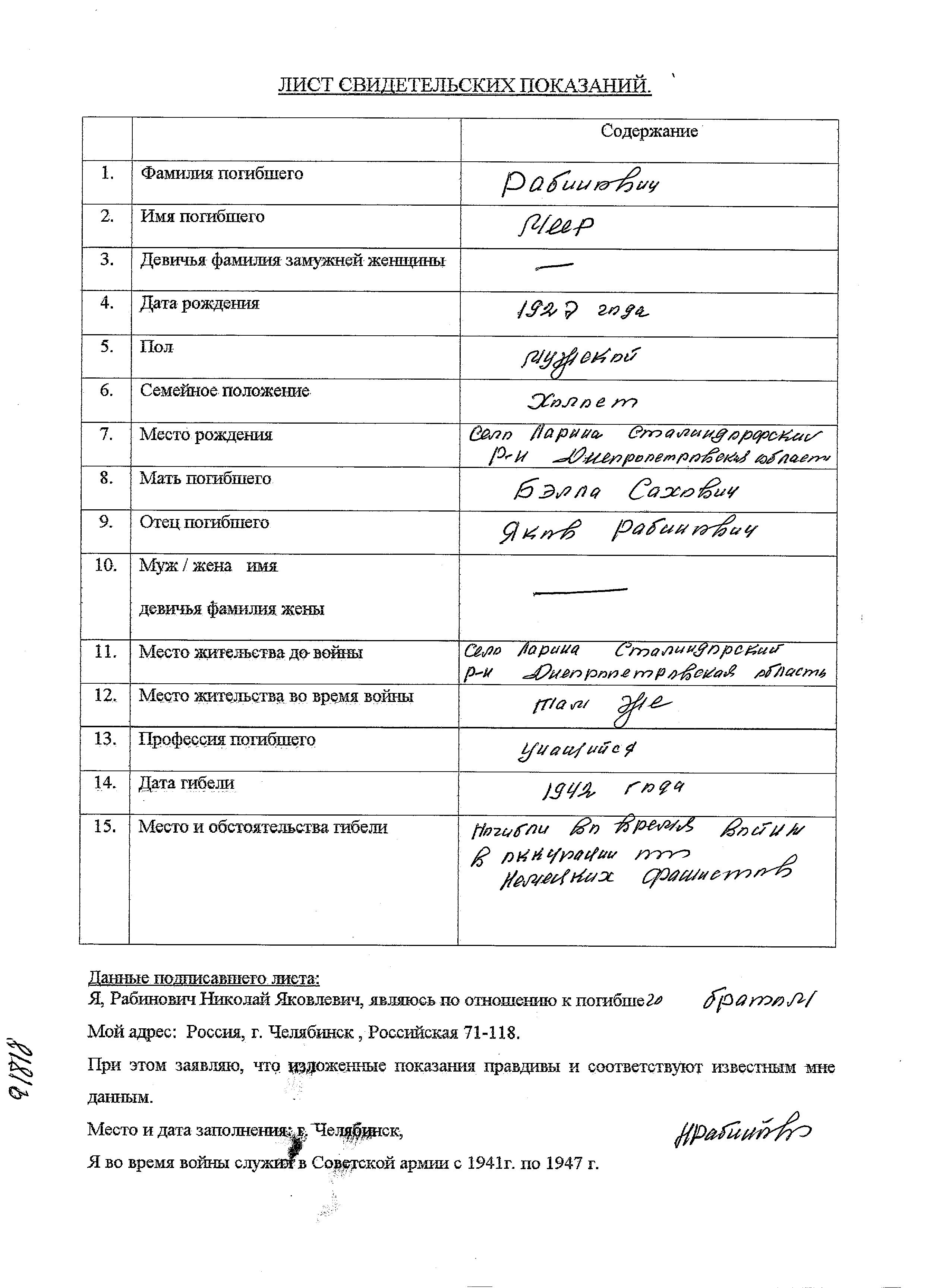 Meyer Rabinovich was born in Larino, Ukraine (USSR), 1927 to Yakov and Bella. He was a pupil. Prior to WWII he lived in Larino, Ukraine (USSR). During the war he was in Larino, Ukraine (USSR). Meyer was murdered in the Shoah. Place of death: Larino, Ukraine (USSR), 1942.