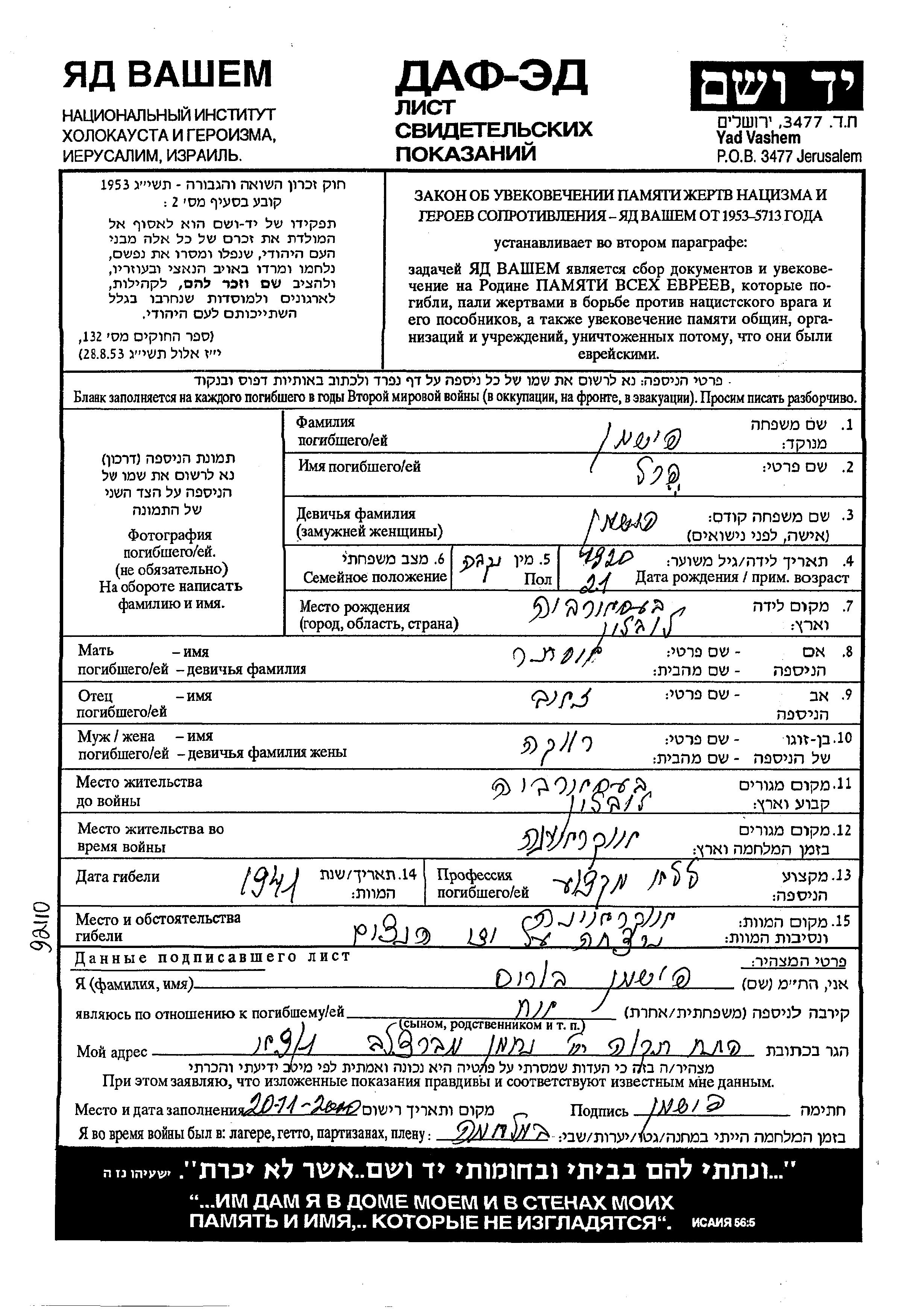 Perel Fishman was born in Lublin Bessarabia, Romania, 1920 to Zeev and Ester. She was single. Prior to WWII she lived in Lublin Bessarabia, Romania. During the war she was in Ukraine (USSR). Perel was murdered in the Shoah. Place of death: Ukraine (USSR), 1941.