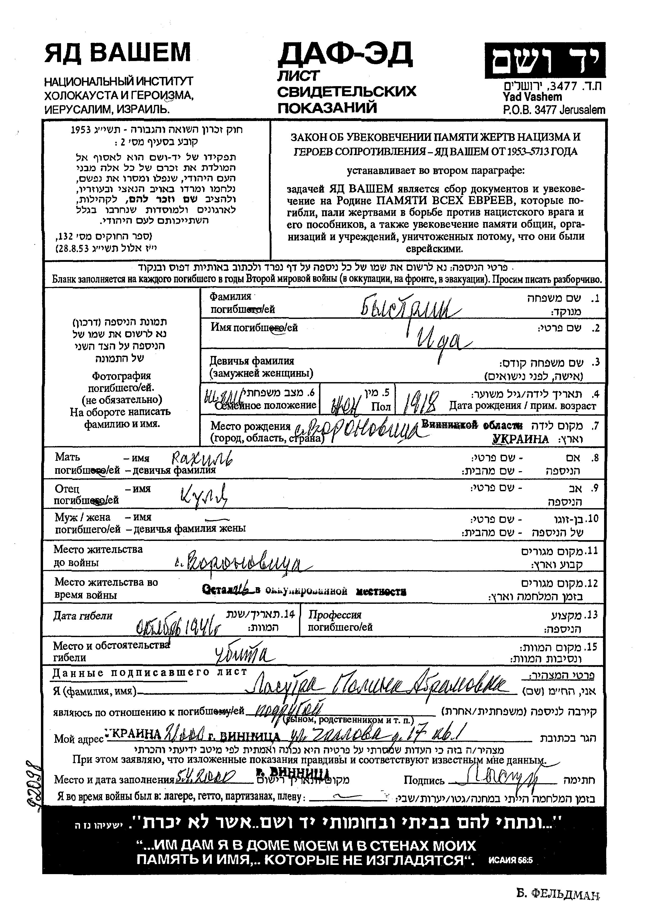 Bystrik Ida 1918 Voronovitsa, Ukraine (USSR) Page of Testimony