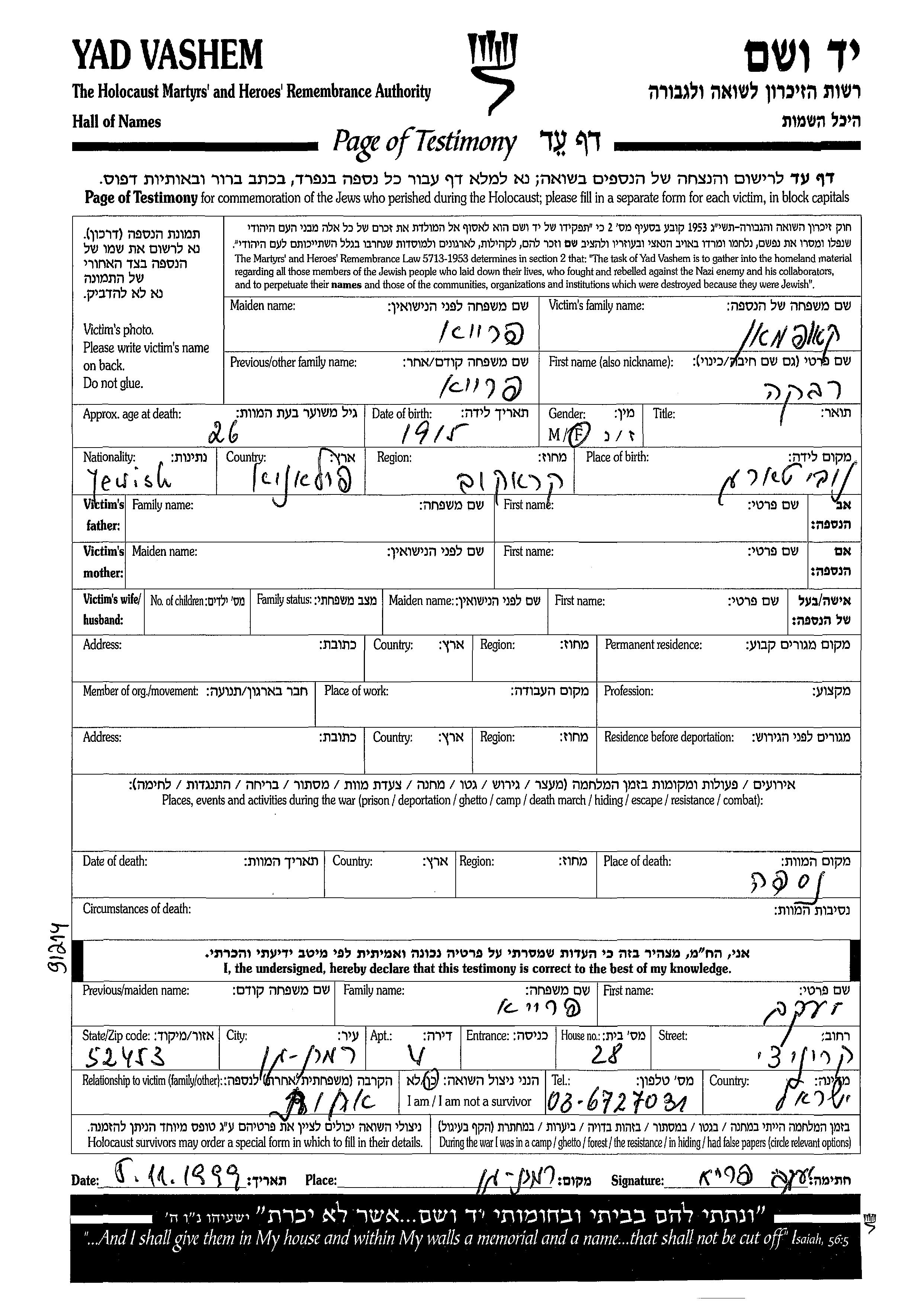 Search by last name of the submitter of the Page of Testimony, including diminutives or nicknames
