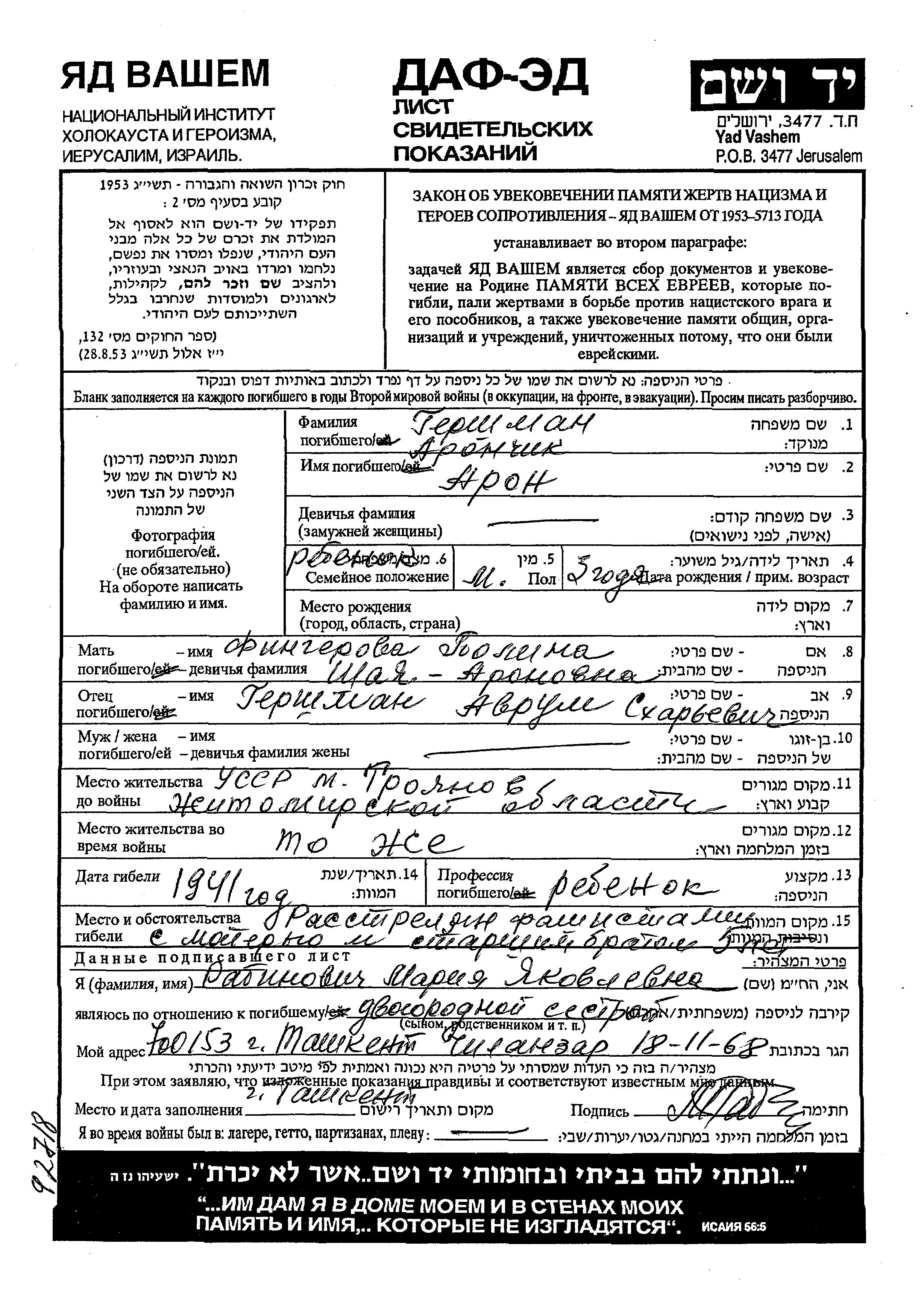 Aron Gershman was born to Avrum and Polina. He was child. Prior to WWII he lived in Troyanov, Ukraine (USSR). During the war he was in Troyanov, Ukraine (USSR). Aron was murdered in the Shoah. Place of death: unknown, 1941.