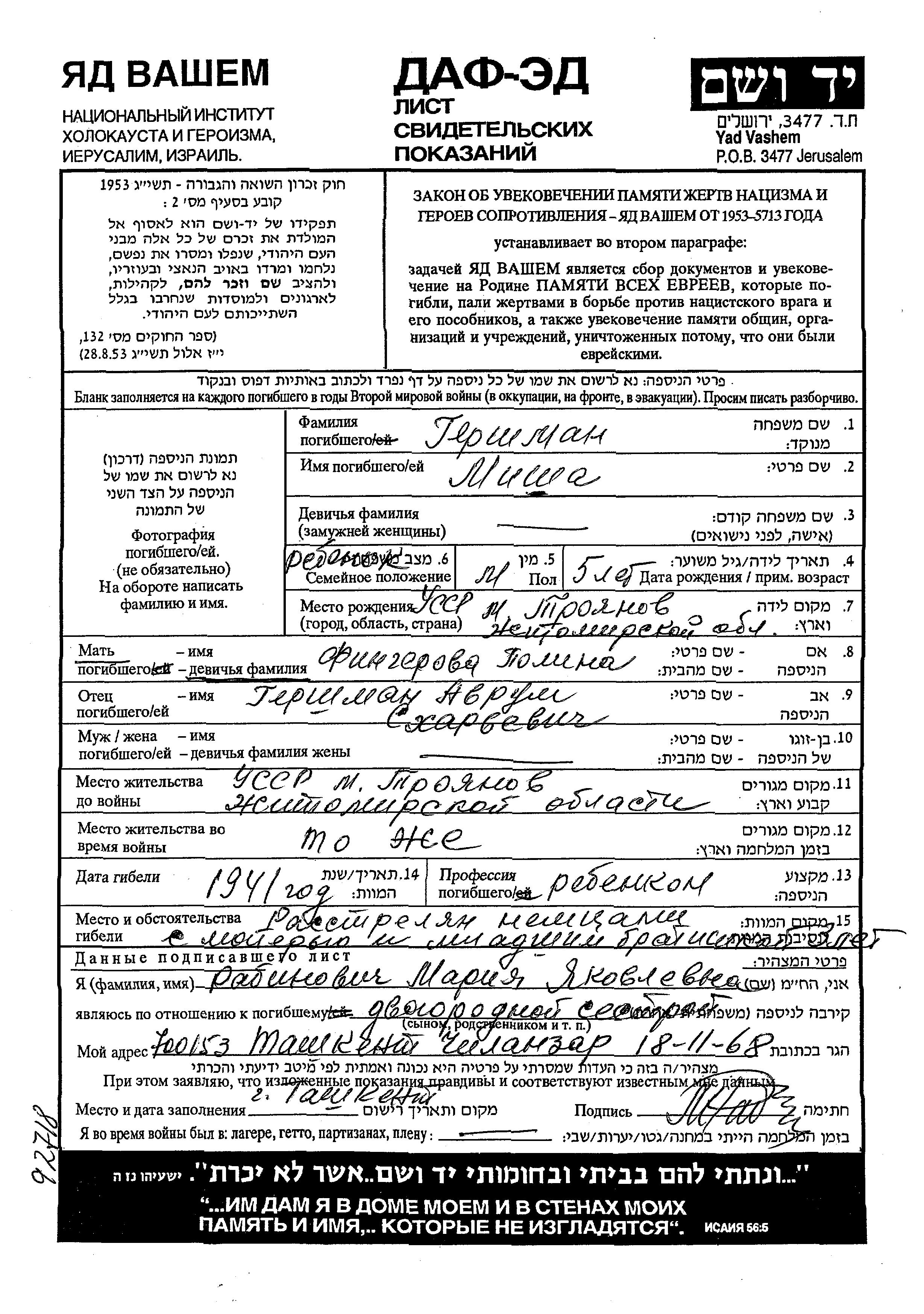 Misha Gershman was born in Troyaniv, Ukraine (USSR) to Avrum and Polina. He was child. Prior to WWII he lived in Troyaniv, Ukraine (USSR). During the war he was in Troyaniv, Ukraine (USSR). Misha was murdered in the Shoah. Place of death: unknown, 1941.