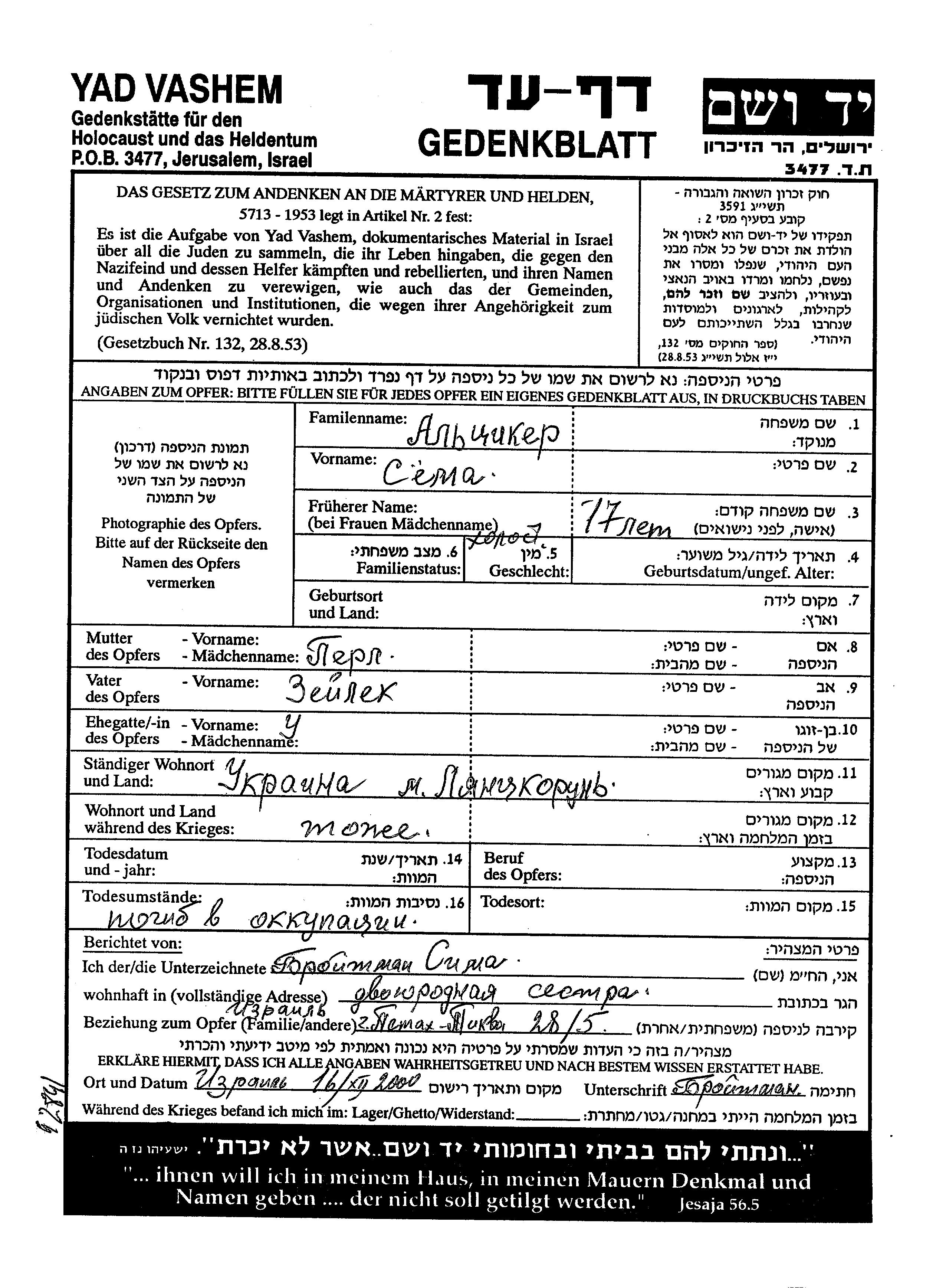 Altziker Syoma Lantzekronia, Ukraine (USSR) Page of Testimony