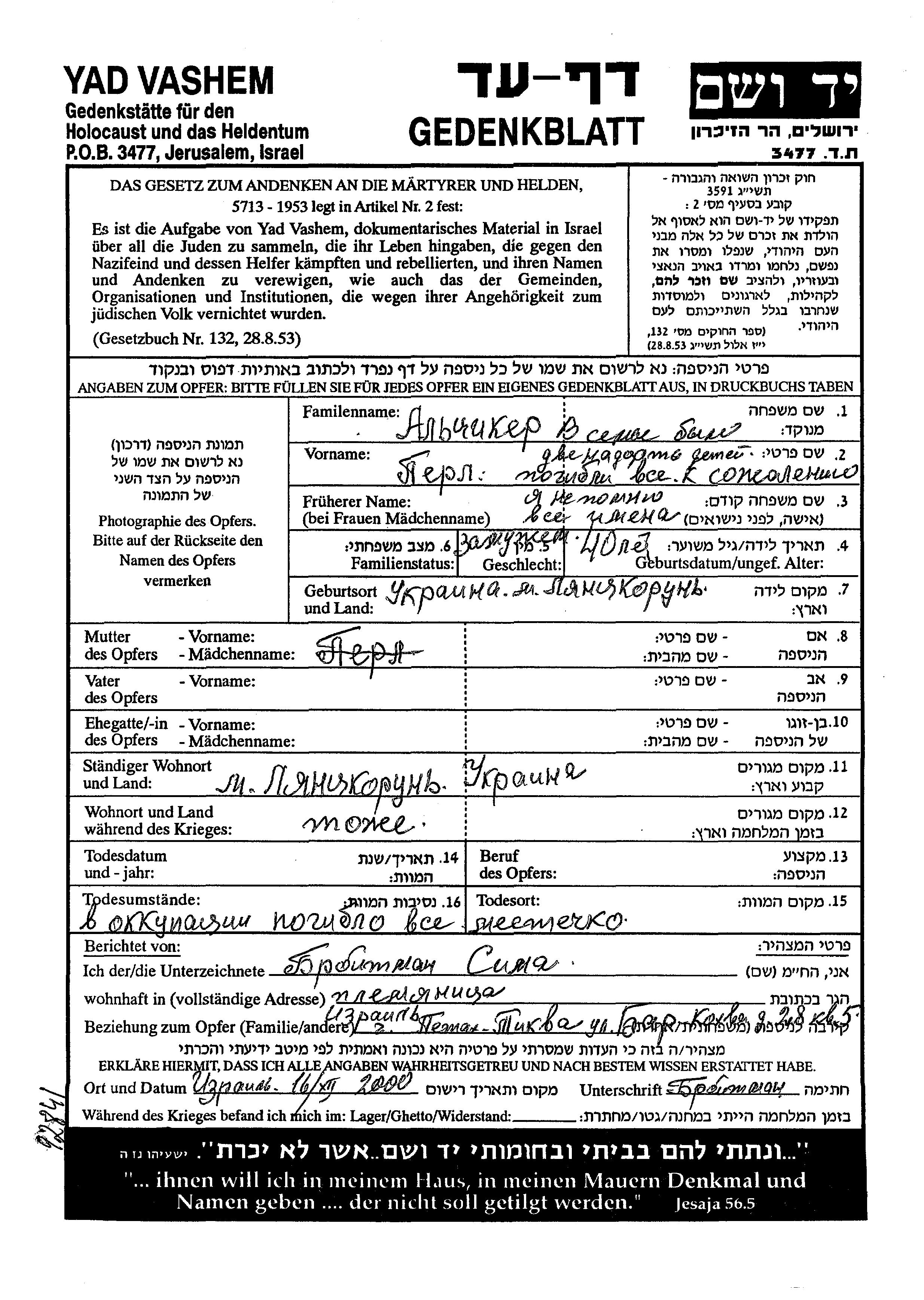 Perl Altziker was born in Lyantskorun, Ukraine (USSR). She was married. Prior to WWII she lived in Lyantskorun, Ukraine (USSR). During the war she was in Lyantskorun, Ukraine (USSR). Perl was murdered in the Shoah. Place of death: Lyantskorun, Ukraine (USSR).